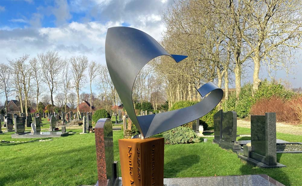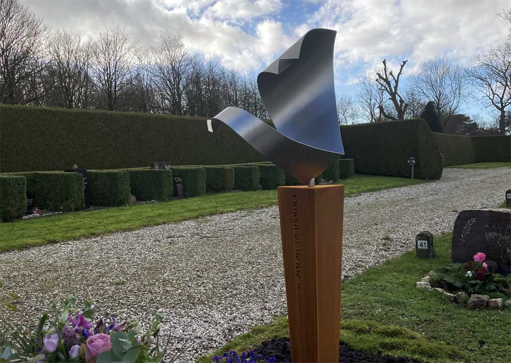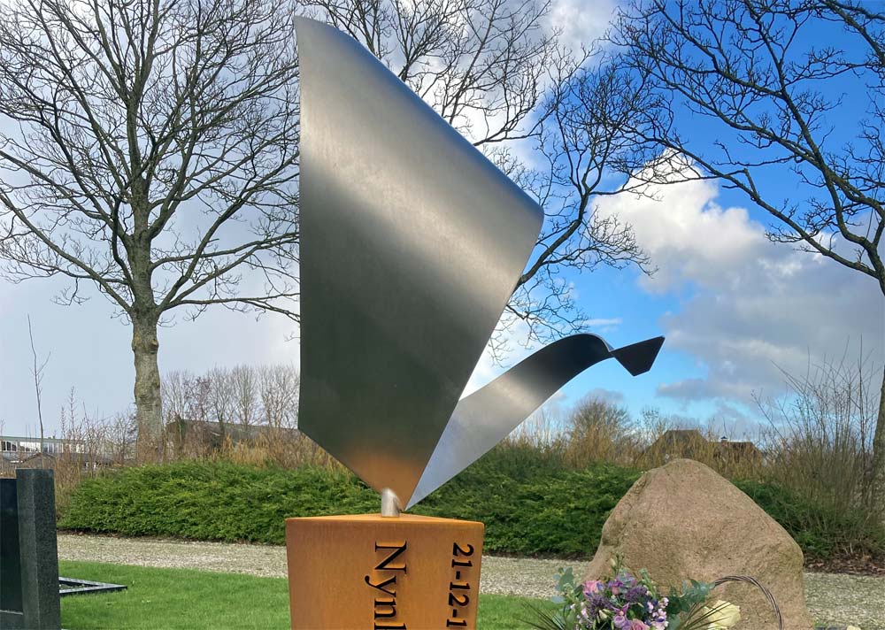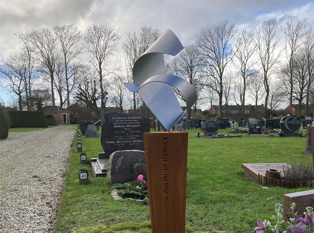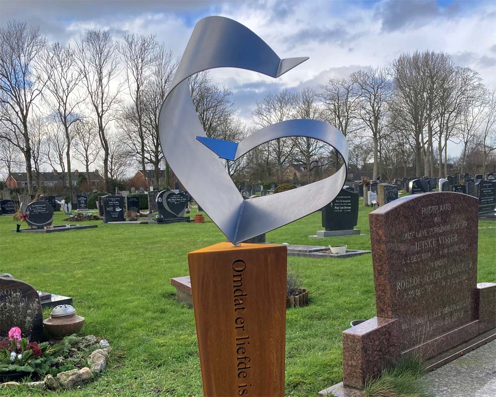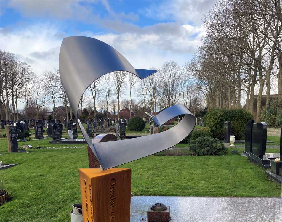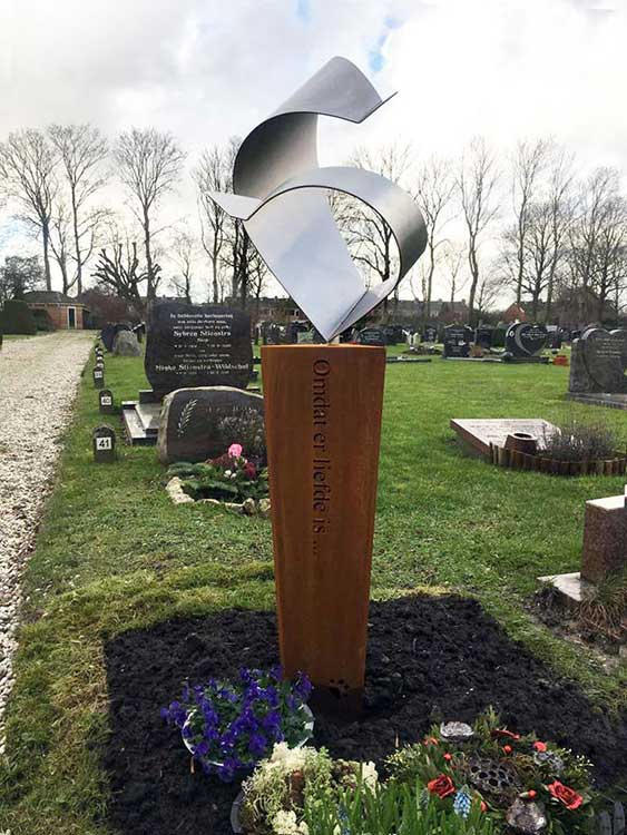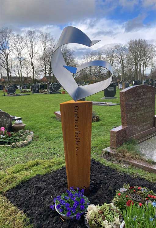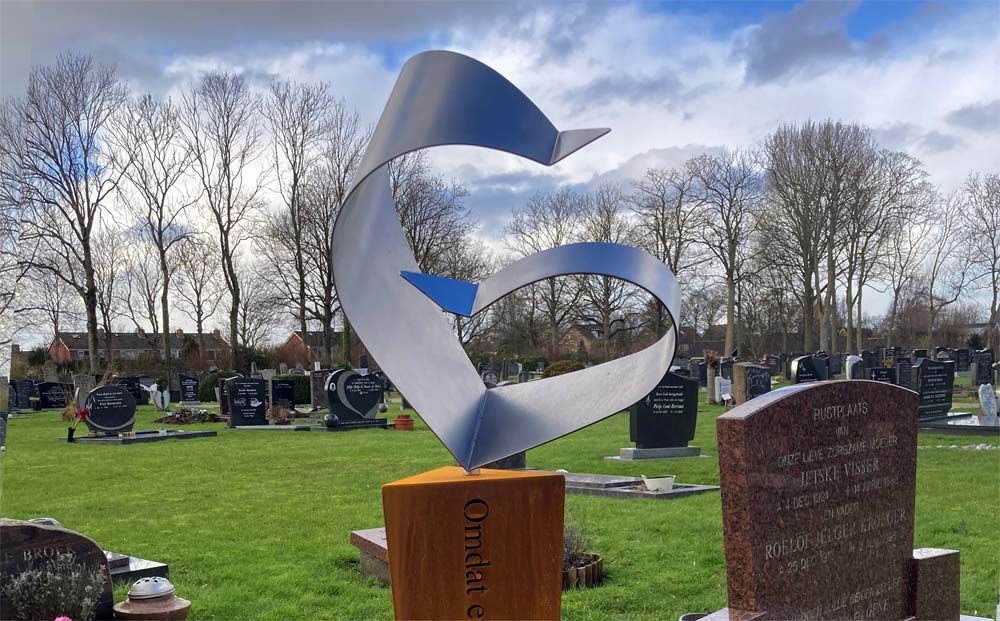 Nynke Marije’s moeder Eveline wist al precies wat ze als monument wilde, ze had een RVS kunstwerk van een hart op mijn website gezien. Toen ze bij mij op bezoek kwamen stond dat specifieke beeld toevallig in mijn tuin. De volgende dag zou het naar een klant gaan die het besteld had.