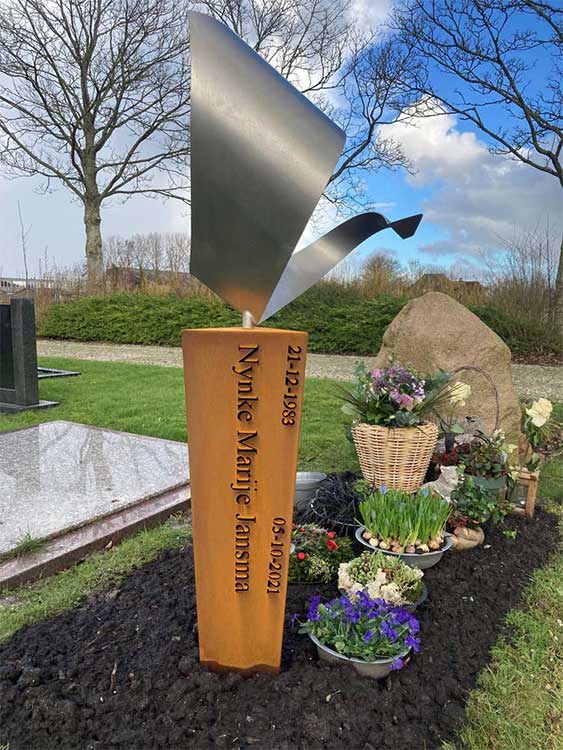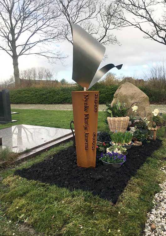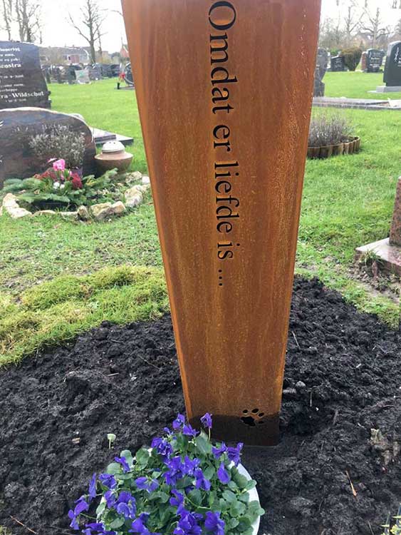 In ieder geval een cortenstalen (geroest) zuil met daarop het RVS beeld. In de zuil werden de naam, data en een tekst “omdat er liefde is” uitgesneden. De pootafdruk van de poes mocht niet ontbreken.