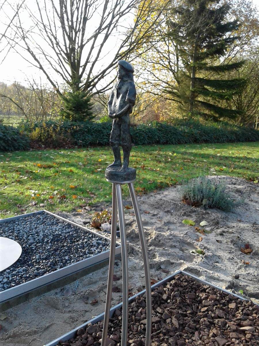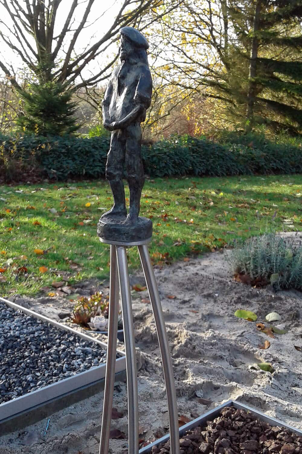 Een bronzen beeldje van de kunstenaar als gedenkteken staat op een RVS driepoot. Het is een klein maar mooi beeldje van brons op een RVS driepoot. De gebogen vorm van de driepoot verwijst naar de veer die de kunstenaar altijd op zijn hoed droeg. Ook doet het hem letterlijk “boven het aardse uitstijgen”.