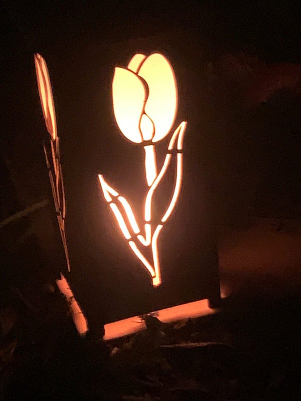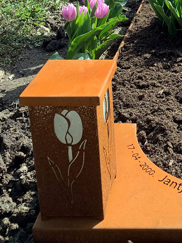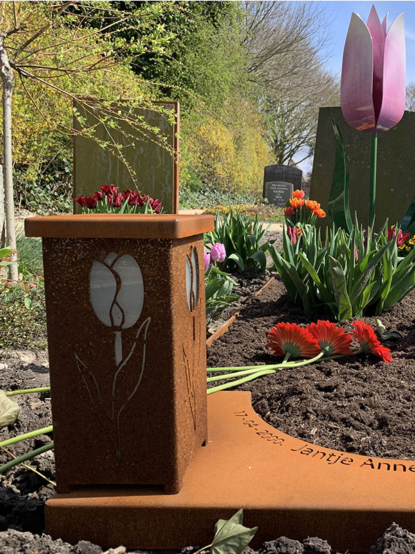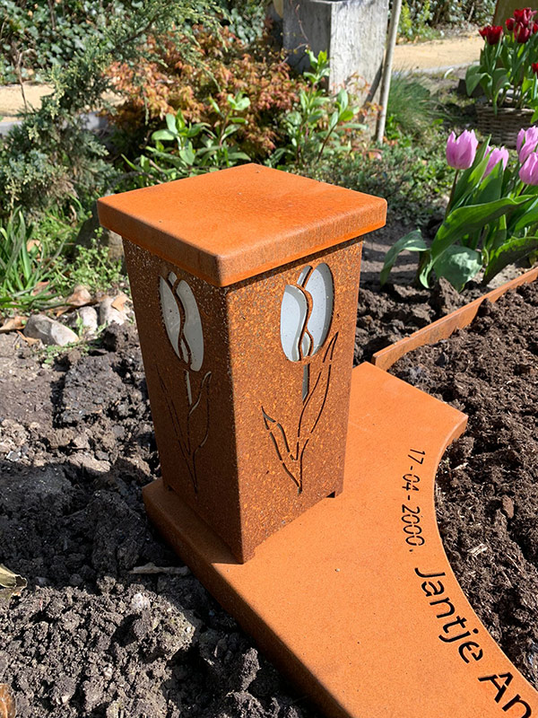 Bij een grafaccessoire als een graflamp is het belangrijk dat deze past bij het geheel van het grafmonument. Daarom ontwierp ik deze graflantaarn van een materiaal dat paste bij het grafmonument van cortenstaal met een gekleurde tulp. In de cortenstalen graflantaarn is een tulpje subtiel uitgespaard aan alle zijden, terwijl de binnenkant van de lantaarn is bekleed met gezandstraald glas, wat zorgt voor een prachtig warm en zacht licht.