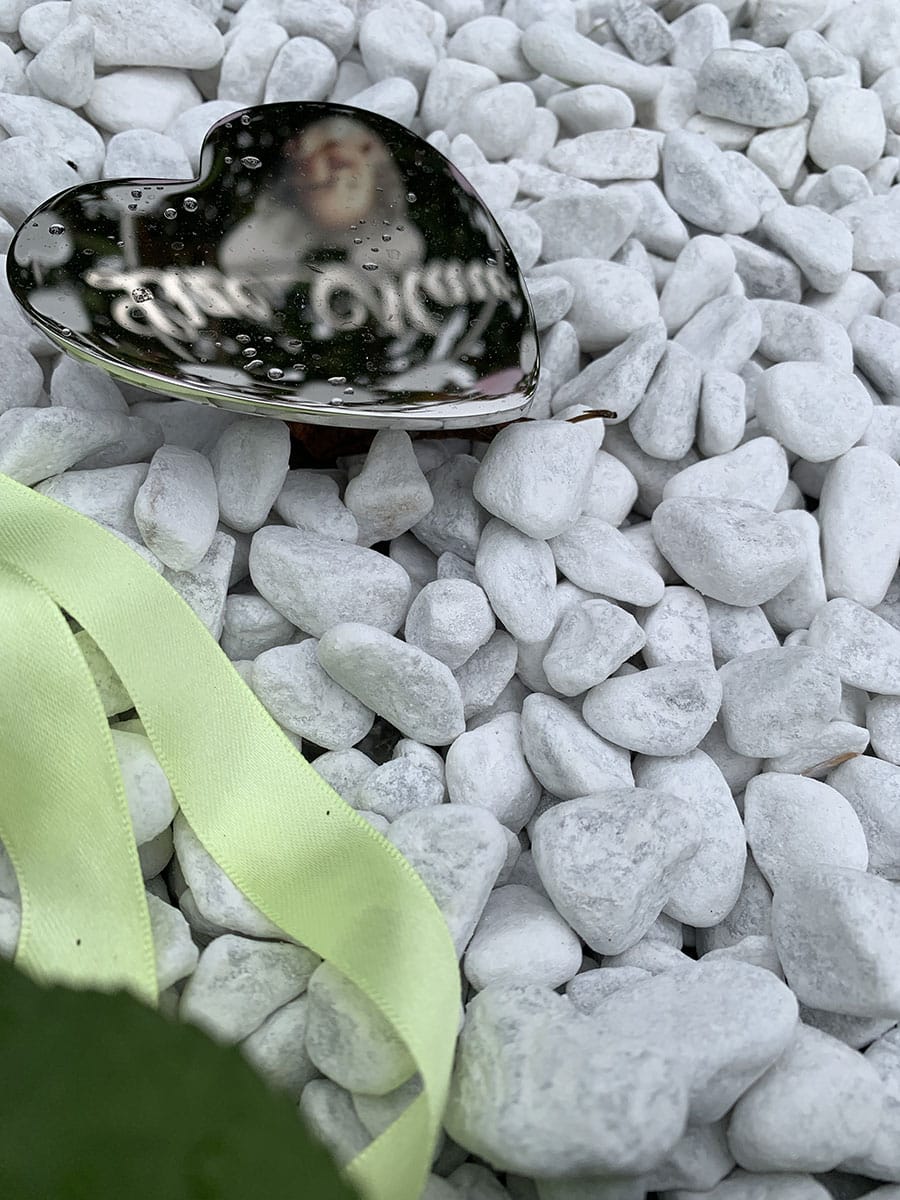 De ouders wilden graag een regenboog in het monument. We maakten een mooi klein wit hartje van glas waar we een regenboogje in smolten. Subtiel, passend en goed zichtbaar.