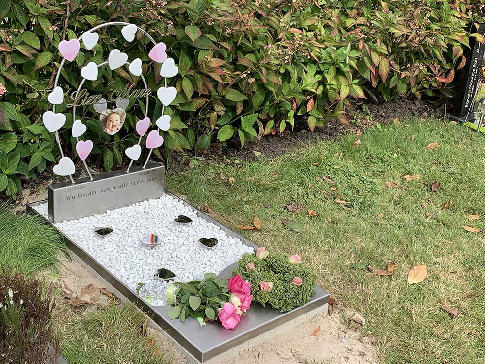 Vooraan is een RVS deel gemaakt waarop bloemen en spulletjes gezet kunnen worden. Ook is het grafje rondom afgekaderd met een subtiele RVS rand. Het middendeel is gevuld met witte Carrera marmer steentjes.