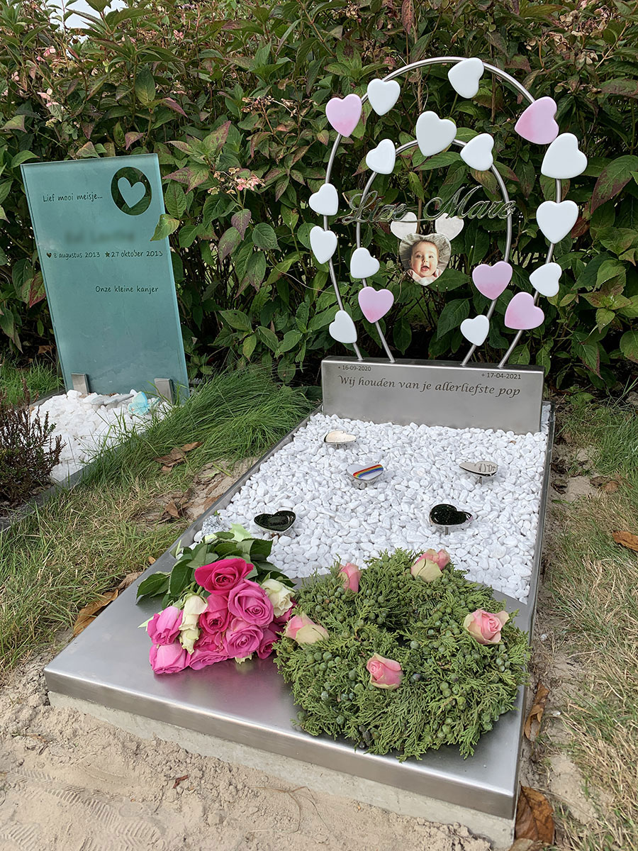 Op de rouwkaart stond de afbeelding van een regenboog met hartjes die als vlinders erom heen fladderden. Dat eenvoudige beeld gebruikten we als basis voor het ontwerp van het monumentje voor Lize Mare.
