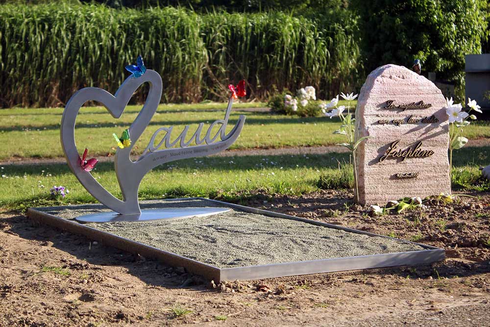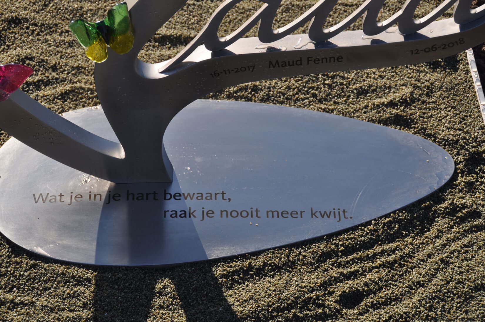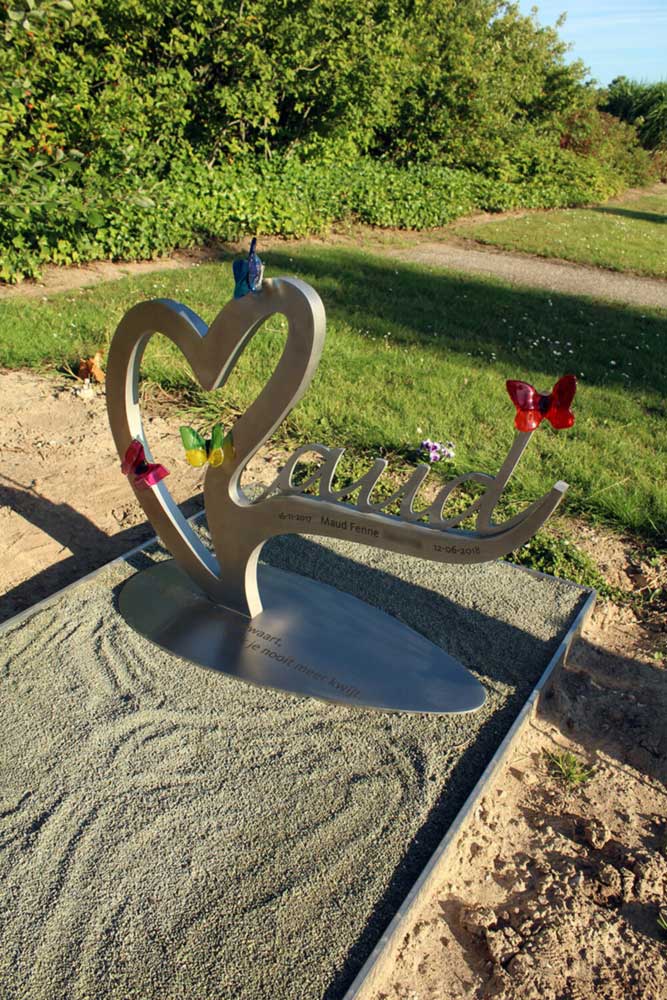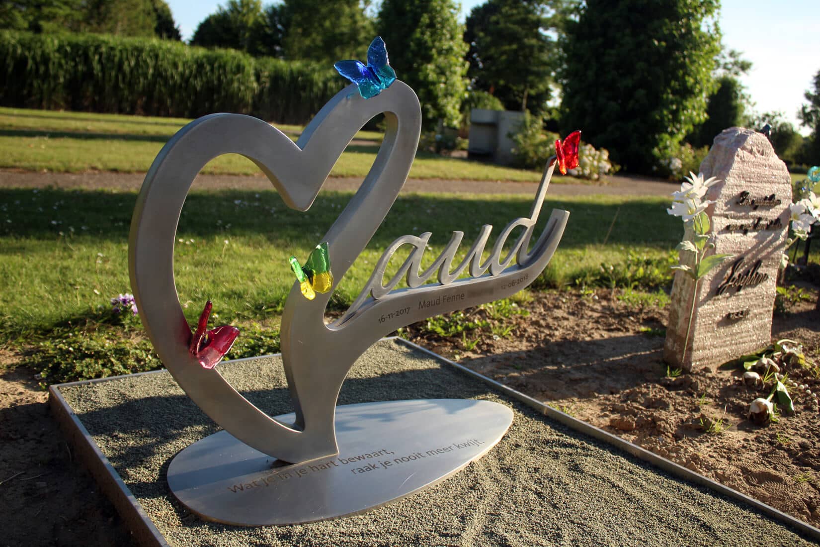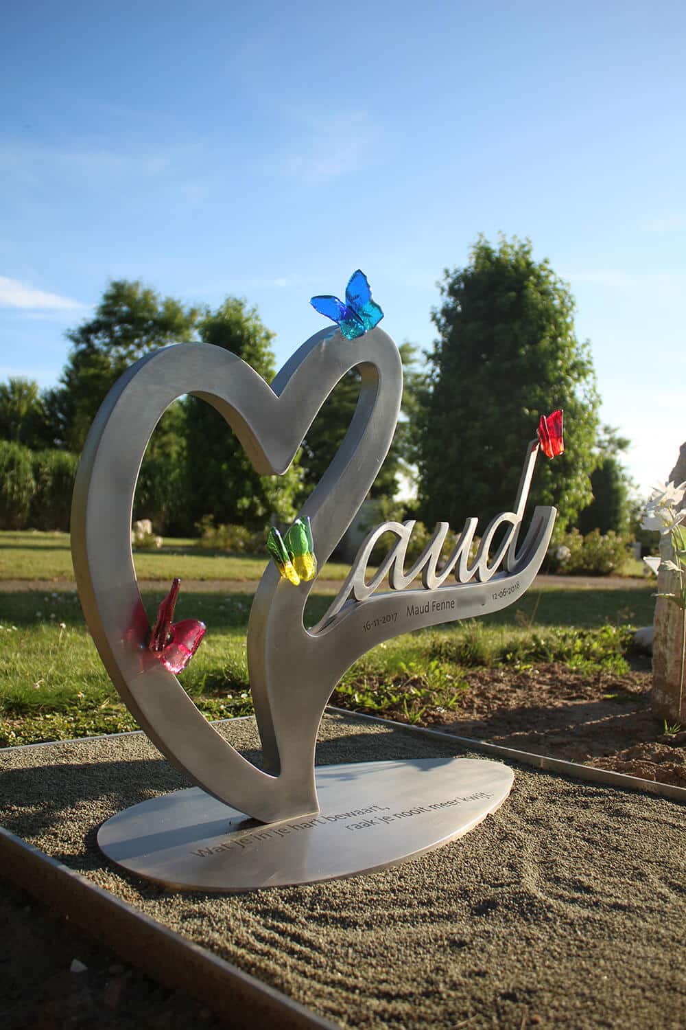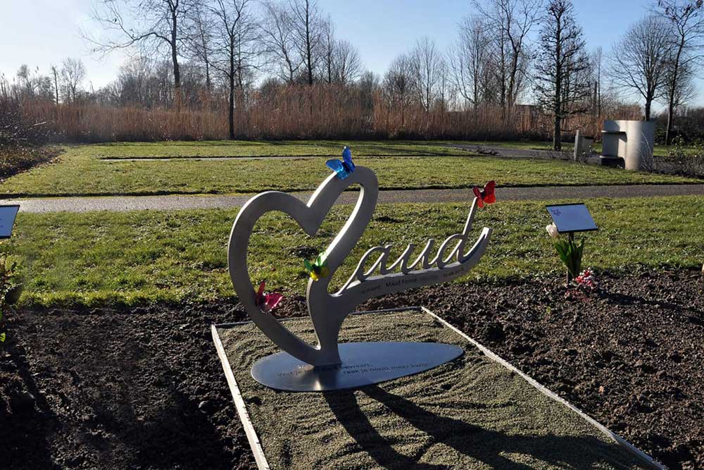 Met wat verbeelding zou je in de hoofdletter M een hart kunnen zien. Dat hebben we uitgewerkt in het ontwerp voor het gedenkteken. Het hart in het babymonument is tevens de hoofdletter M van Maud. Uit dit hart groeit een tak waarop de andere letters staan. De geboortedatum, de volledige naam en de datum van overlijden volgen de richting van tak, die omhoog loopt.