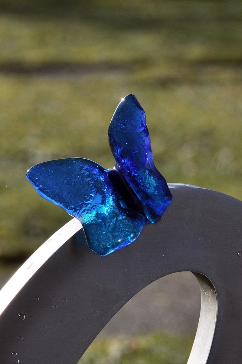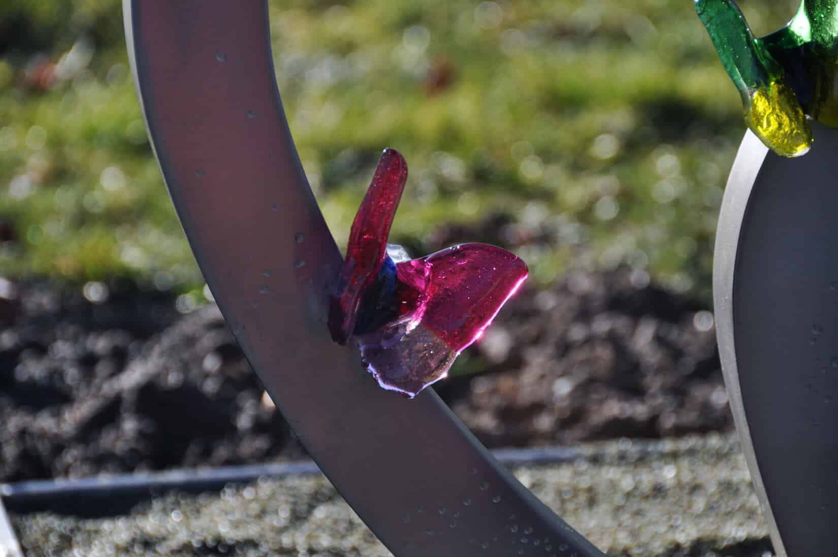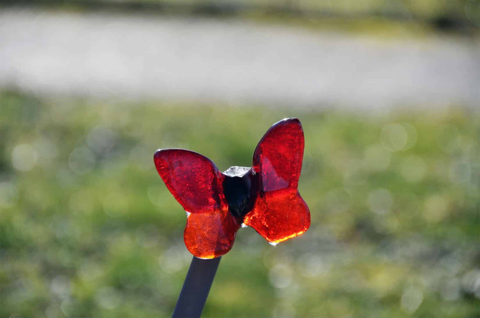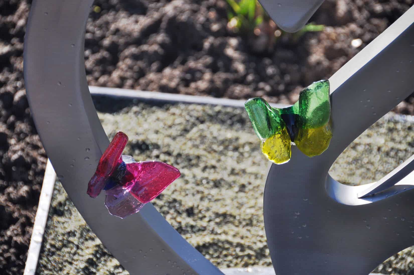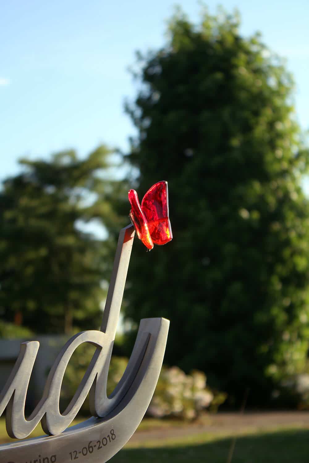 De naam van Maud wordt omcirkeld door gekleurde glazen vlinders, die de ouders speciaal op kleur en vorm hebben uitgezocht. Ook de positie van de vlinders is in samenspraak bepaald.