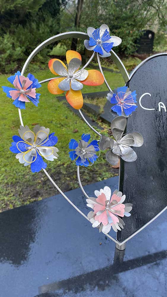Een unieke grafsteen met een hart vol bloemen