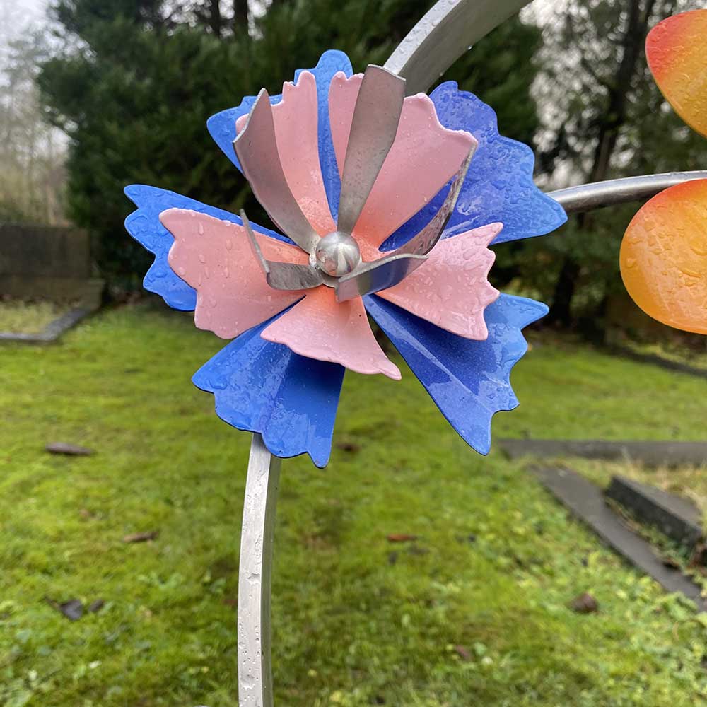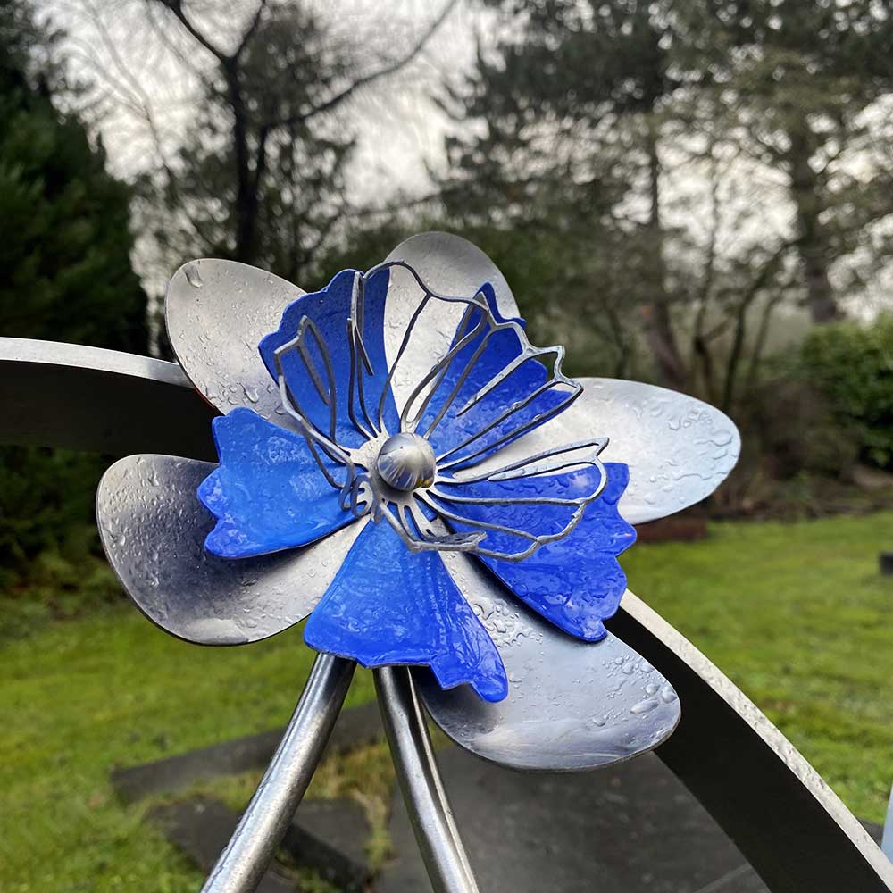 Van de papieren bloemen maakten we op verzoek van de nabestaanden eerst een paar van RVS ter beoordeling. Uiteindelijk werd opdracht gegeven om 7 bloemen te maken. In een later stadium werd nog een extra bloem besteld. Iedere bloem is uniek en staat voor een familielid.