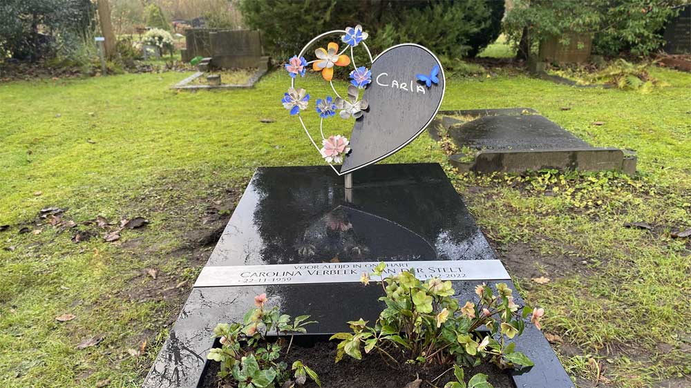 De grafsteen heeft een hartvorm en is voorzien van handgemaakte bloemen van rvs, zorgvuldig gespoten in haar favoriete kleuren. Carla’s naam is in haar eigen handschrift gegraveerd in Indian Black graniet, een steensoort die bekendstaat om zijn duurzaamheid en stijlvolle uitstraling. De mooie blauwe vlinder van rvs bij haar naam voegt een extra symbolische betekenis toe.