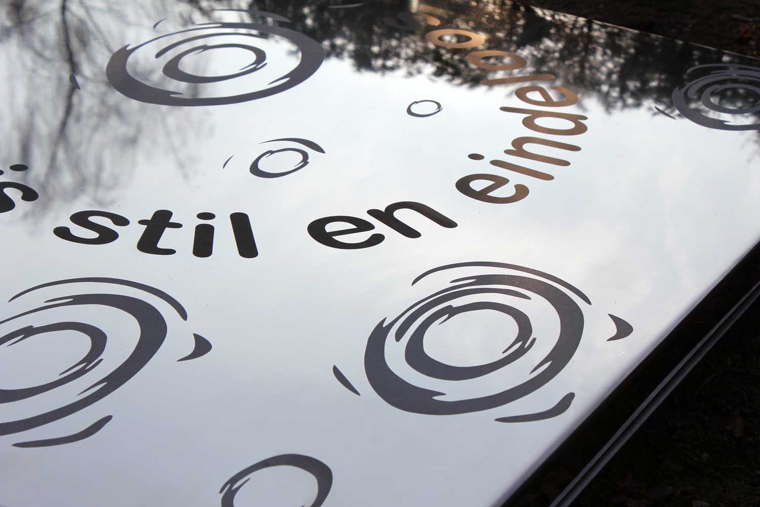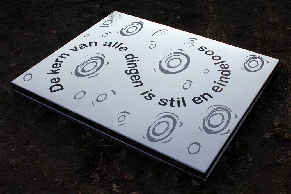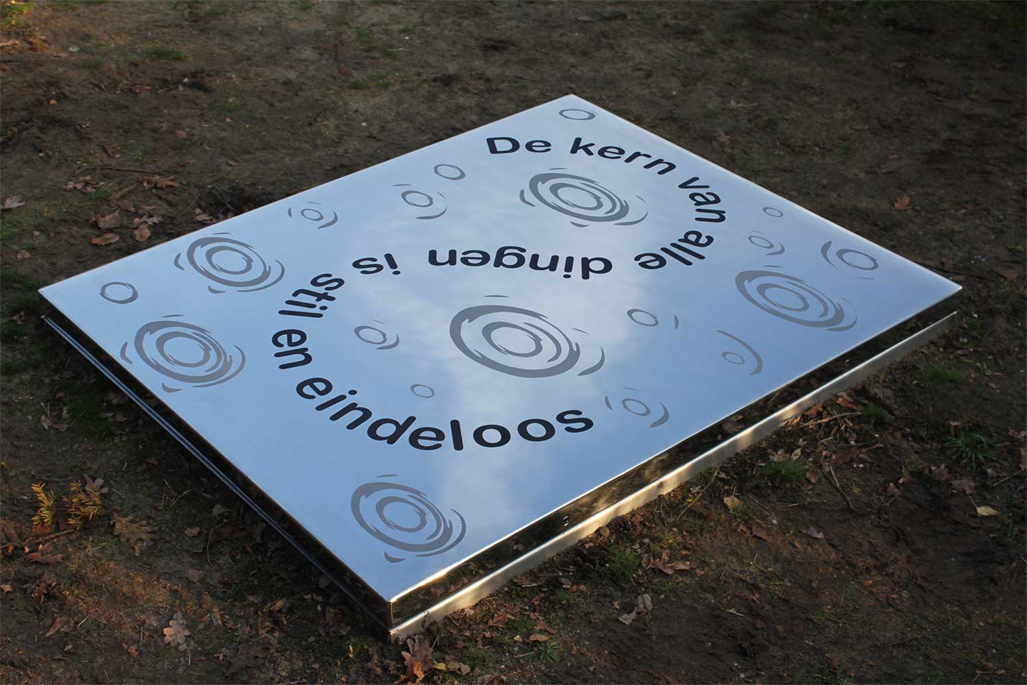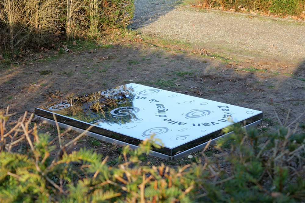 Op verzoek van de begraafplaats in Naarden (Nieuw Valkeveen) ontwierp ik een grafzerk als herdenkingsmonument die op het verzamelgraf geplaatst werd. Een heldere spiegelende RVS plaat met kringen als druppels die in het water vallen en een versregel gegraveerd.