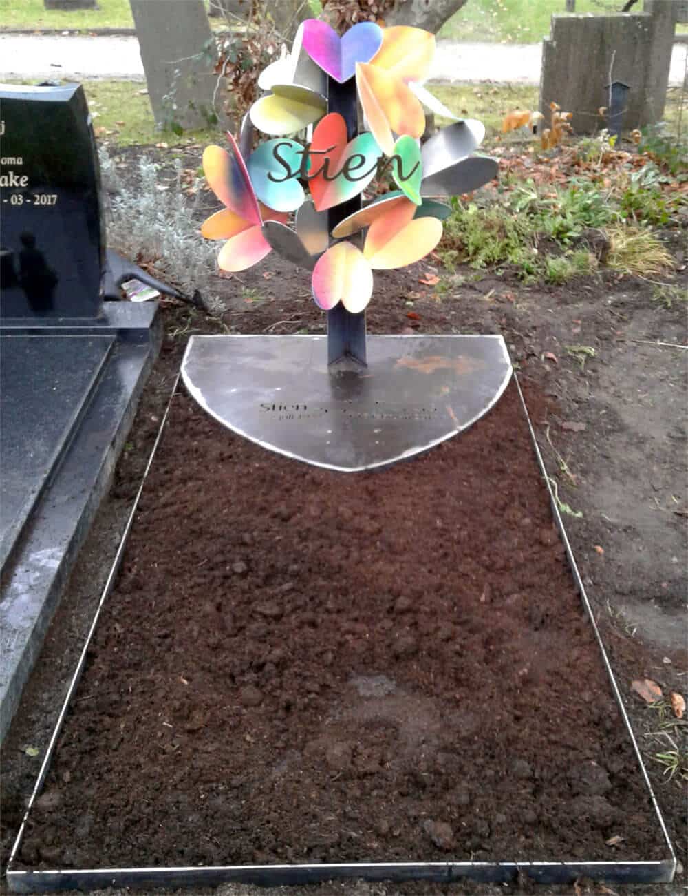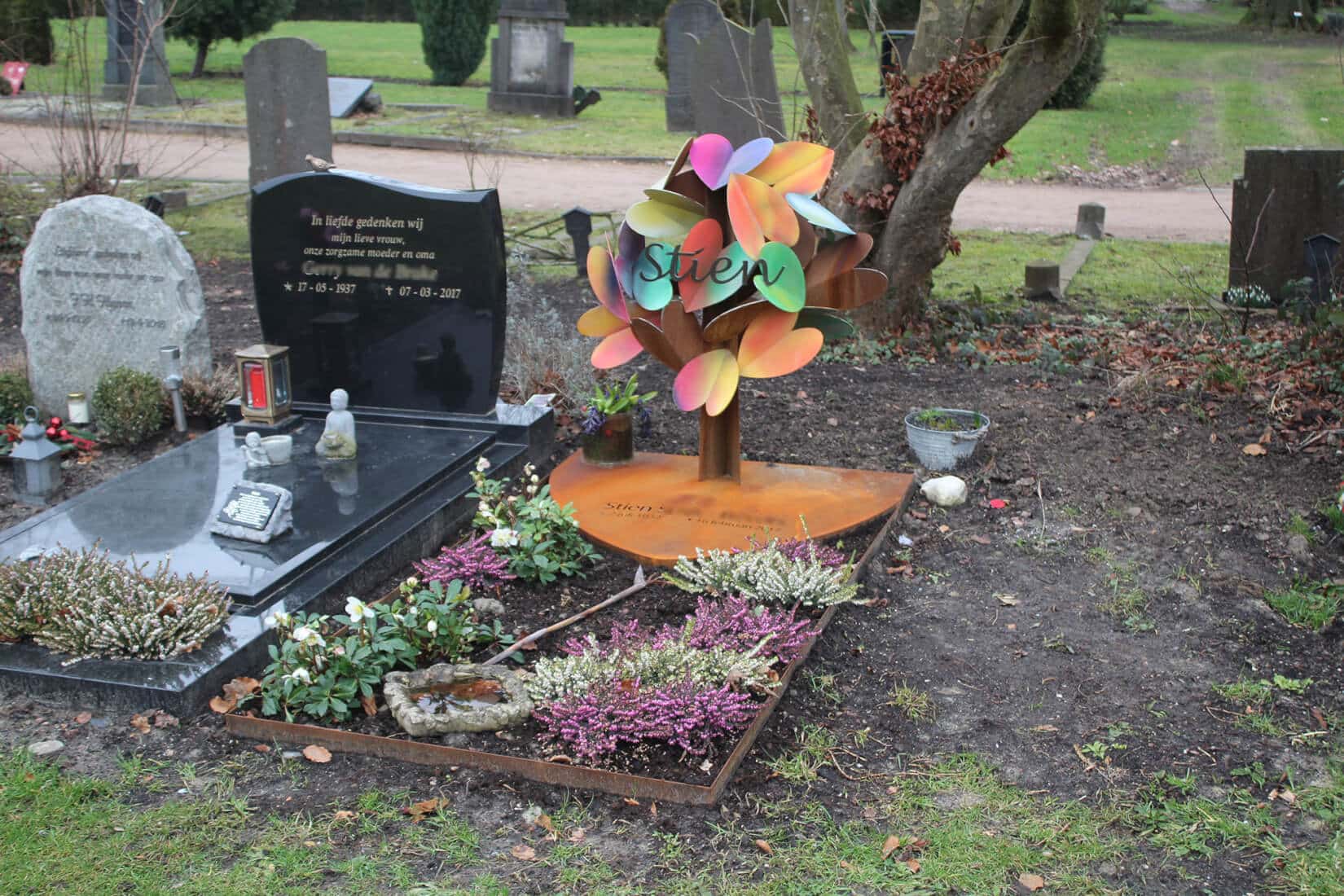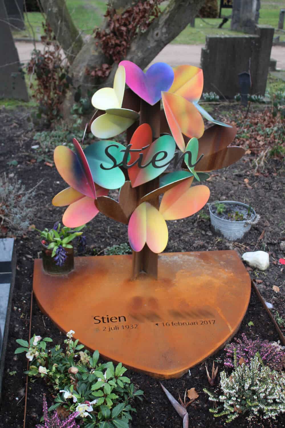 Een corten grafmonument met een boom van kleurrijke harten is een blikvanger op de begraafplaats. Het is een artistiek en kunstzinnig eerbetoon aan een oude dame. Deze moderne en artistieke stijl paste bij haar.