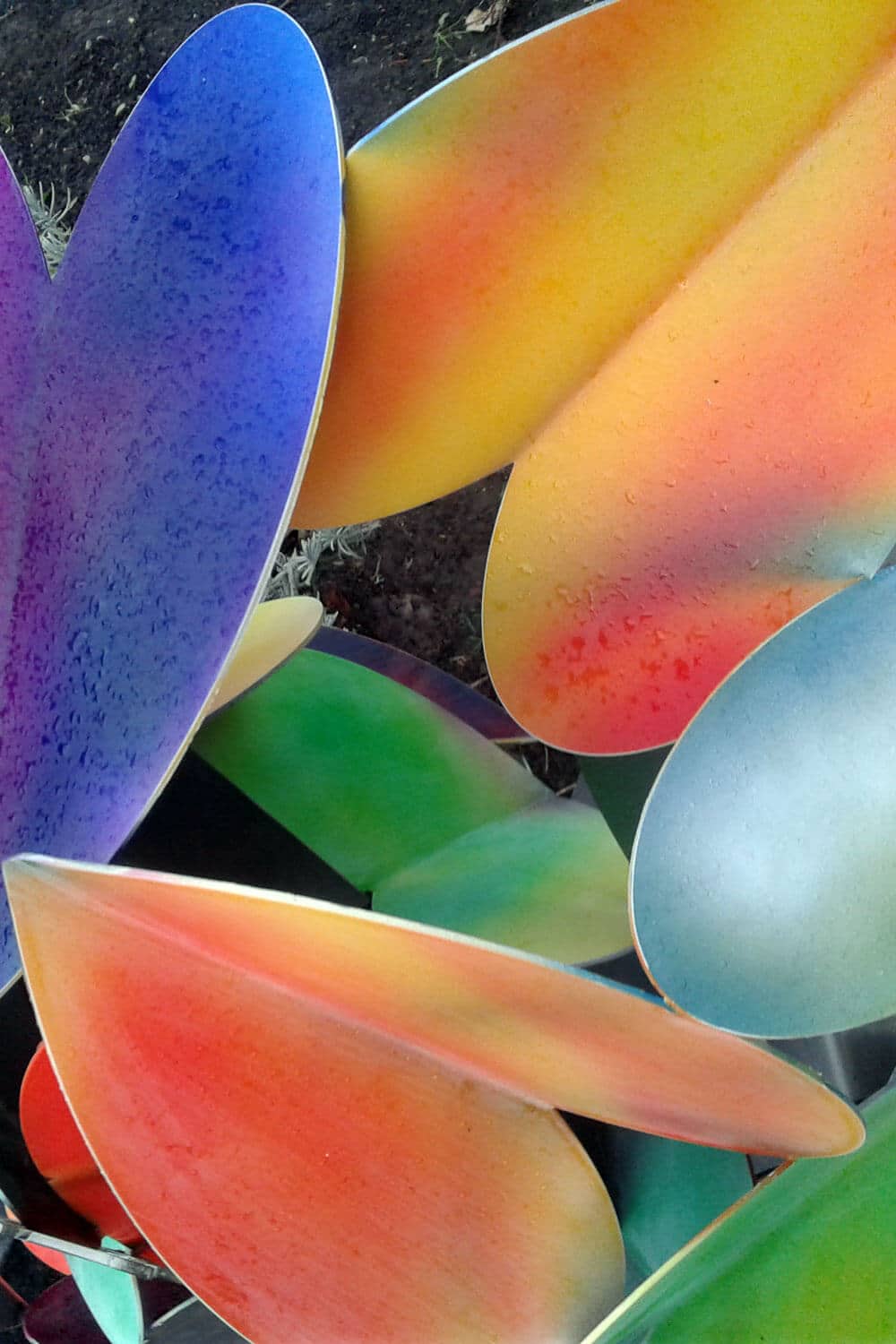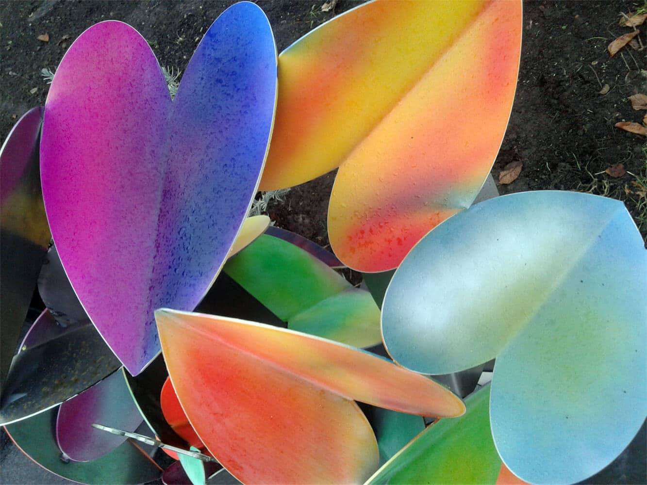 De naam Stien die de gekleurde harten dragen is gemaakt van RVS-316 en zwart geëtst. Op de overgang tussen het cortenstaal en het RVS zal enige roest komen.