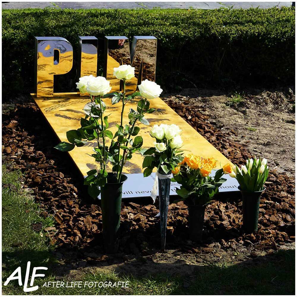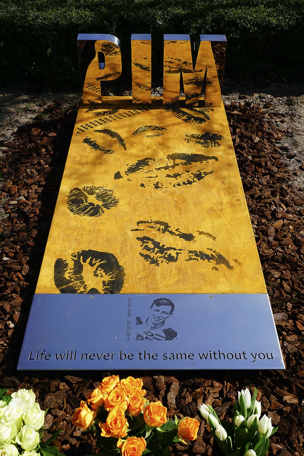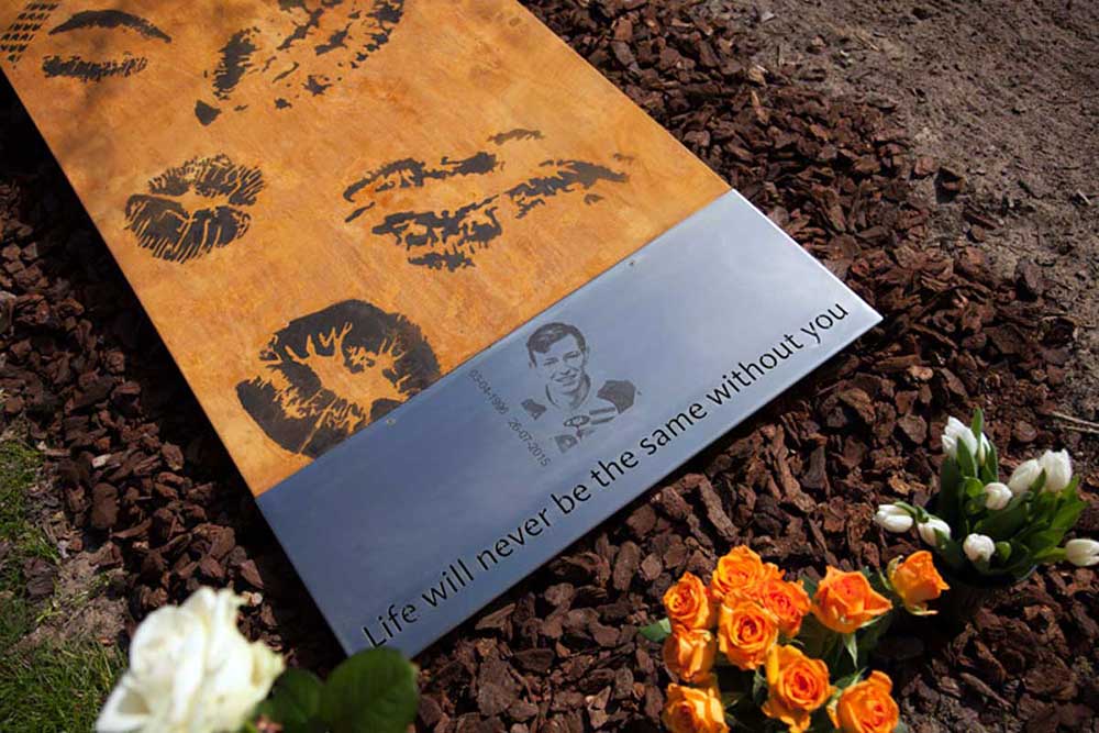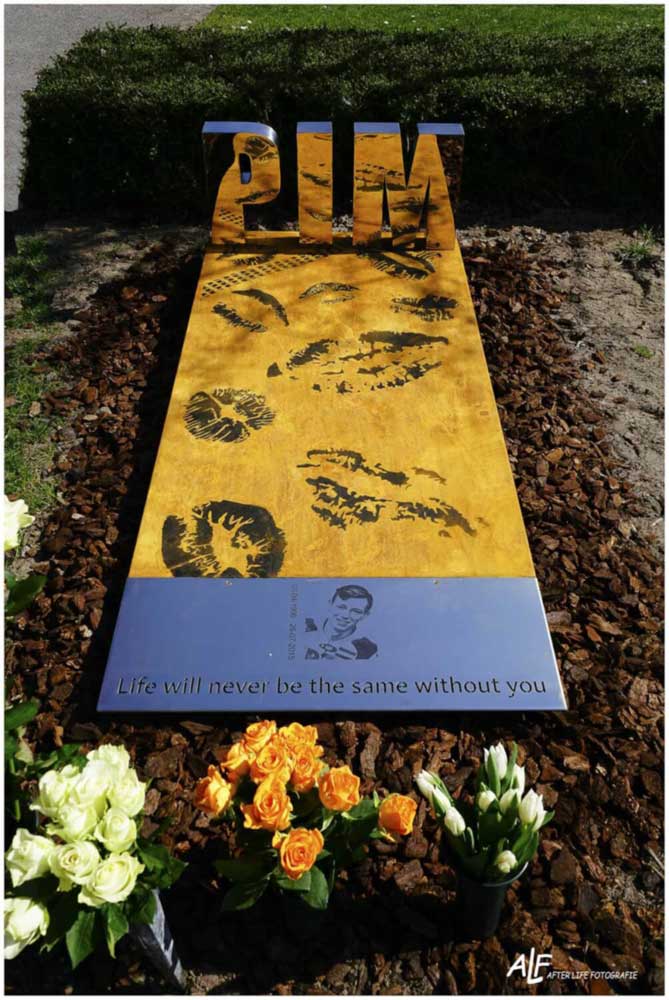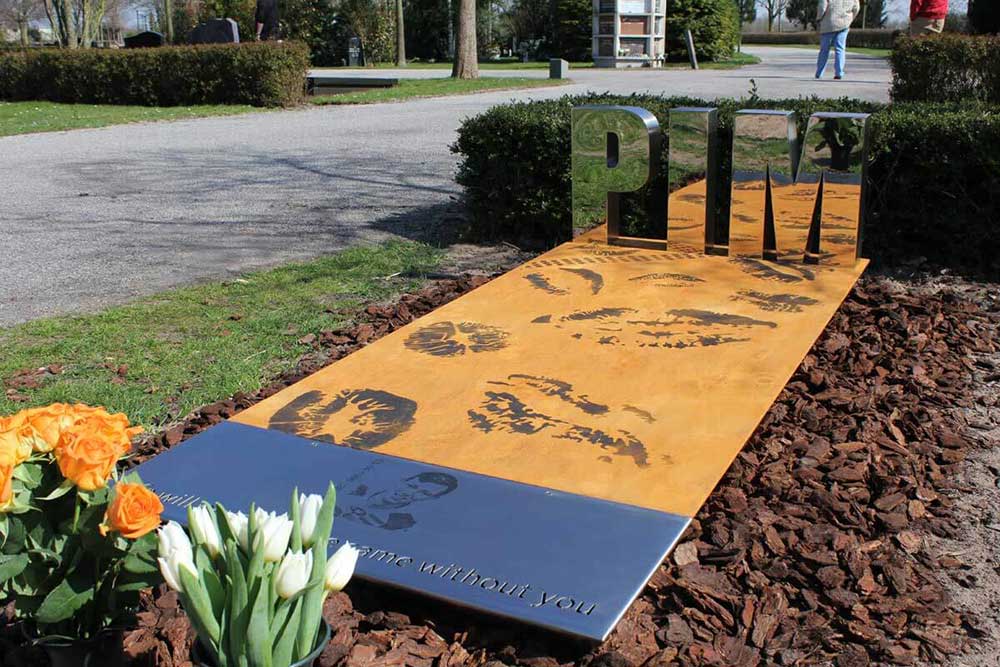 Uit het staal is de tekst weggesneden. “Life will never be the same without you”. Pim’s naam staat in gepolijste RVS letters op het hoofdeinde van de corten grafzerk.
