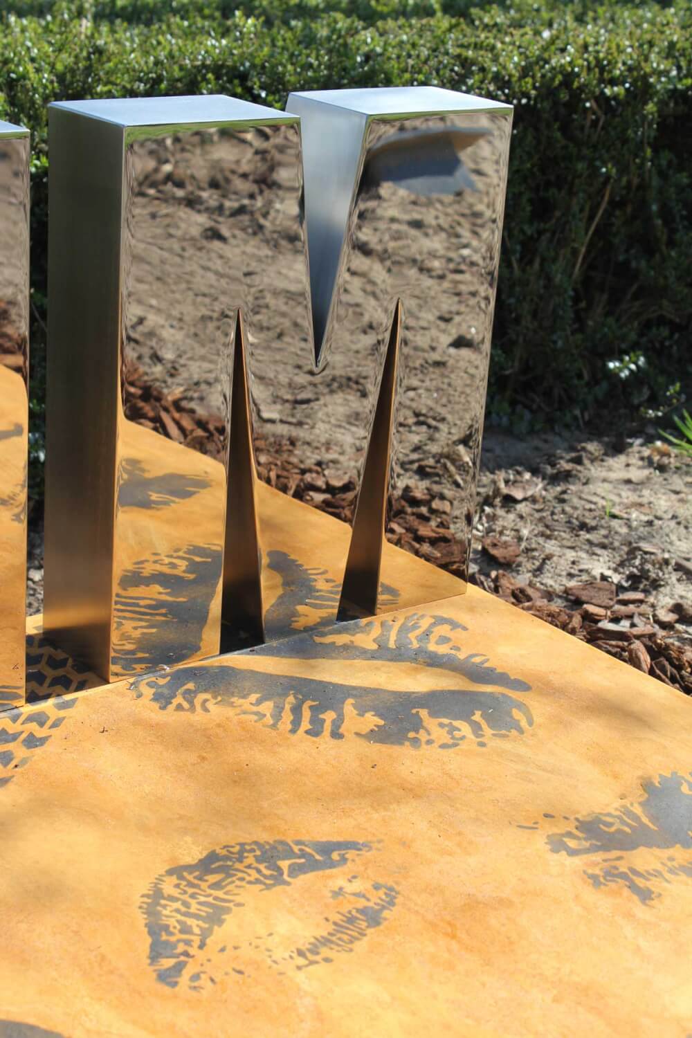 In geroest staal is een bandenspoor uitgesneden. Daarnaast tal van lipafdrukken (kussen) die opgevuld werden met rubber. Echte lipafdrukken zijn gebruikt om de kussen in het monument te maken.