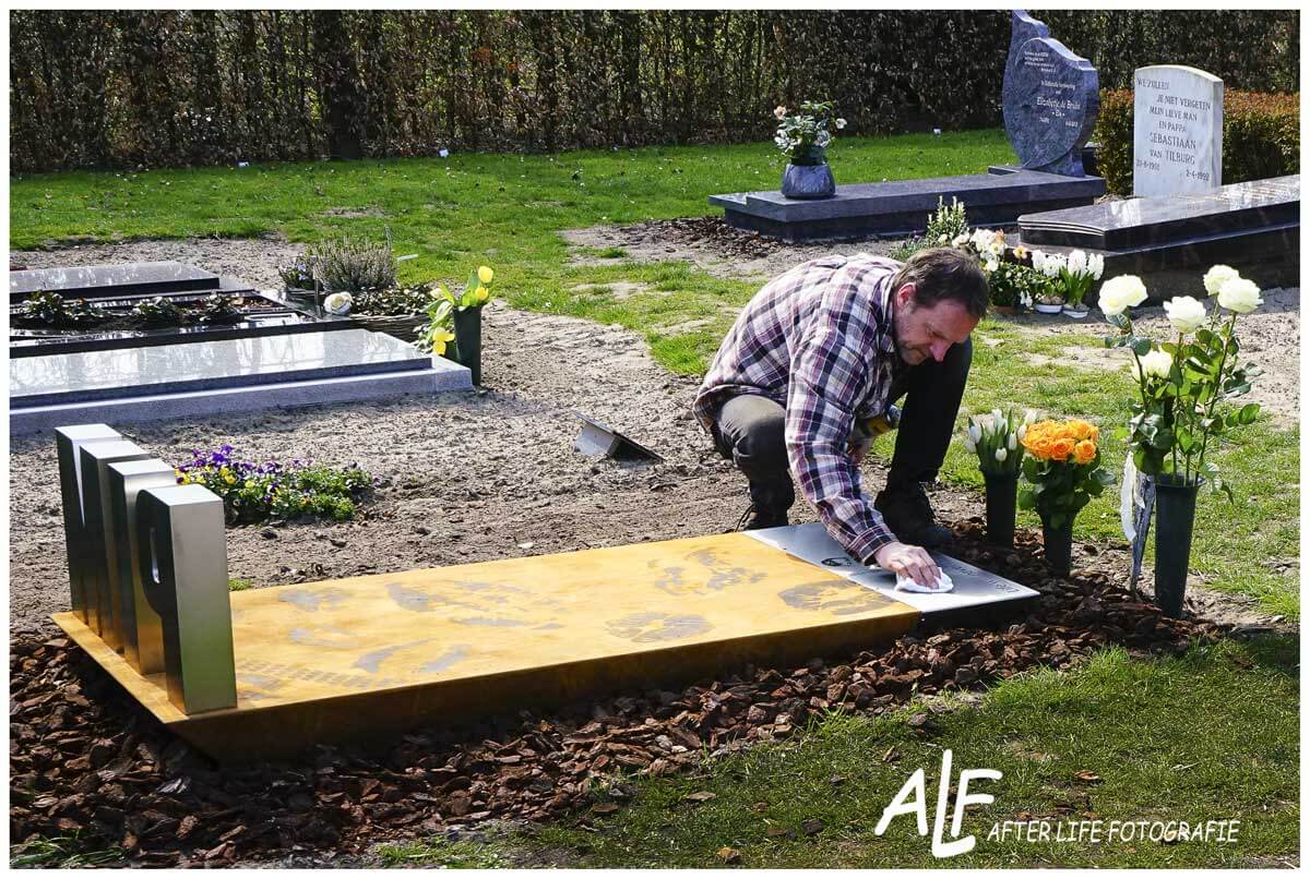 Op Pim’s verjaardag plaatsten we een unieke corten grafsteen met RVS op zijn graf. Het monument werd door familieleden en vrienden gedragen. Letterlijk, maar ook figuurlijk een last die nauwelijks te tillen was.