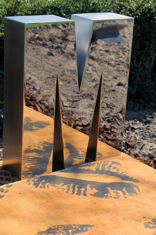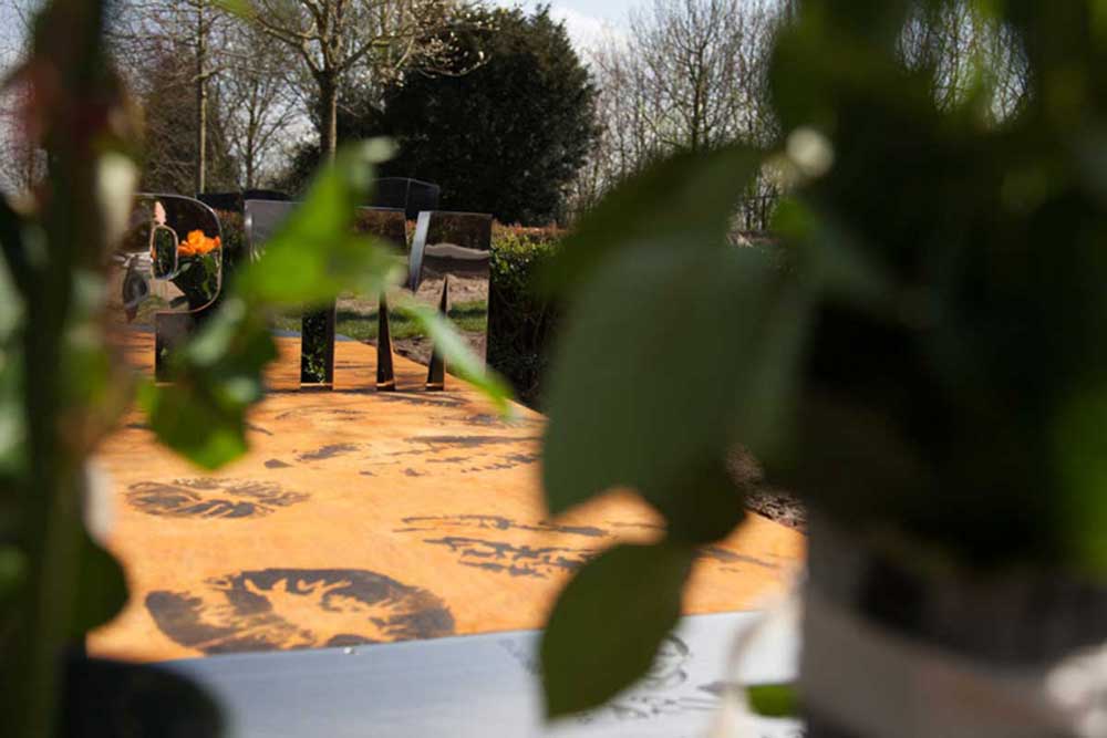 De zijkanten van de corten grafsteen lopen iets naar binnen weg om het geheel minder massief en zwaar te doen ogen.