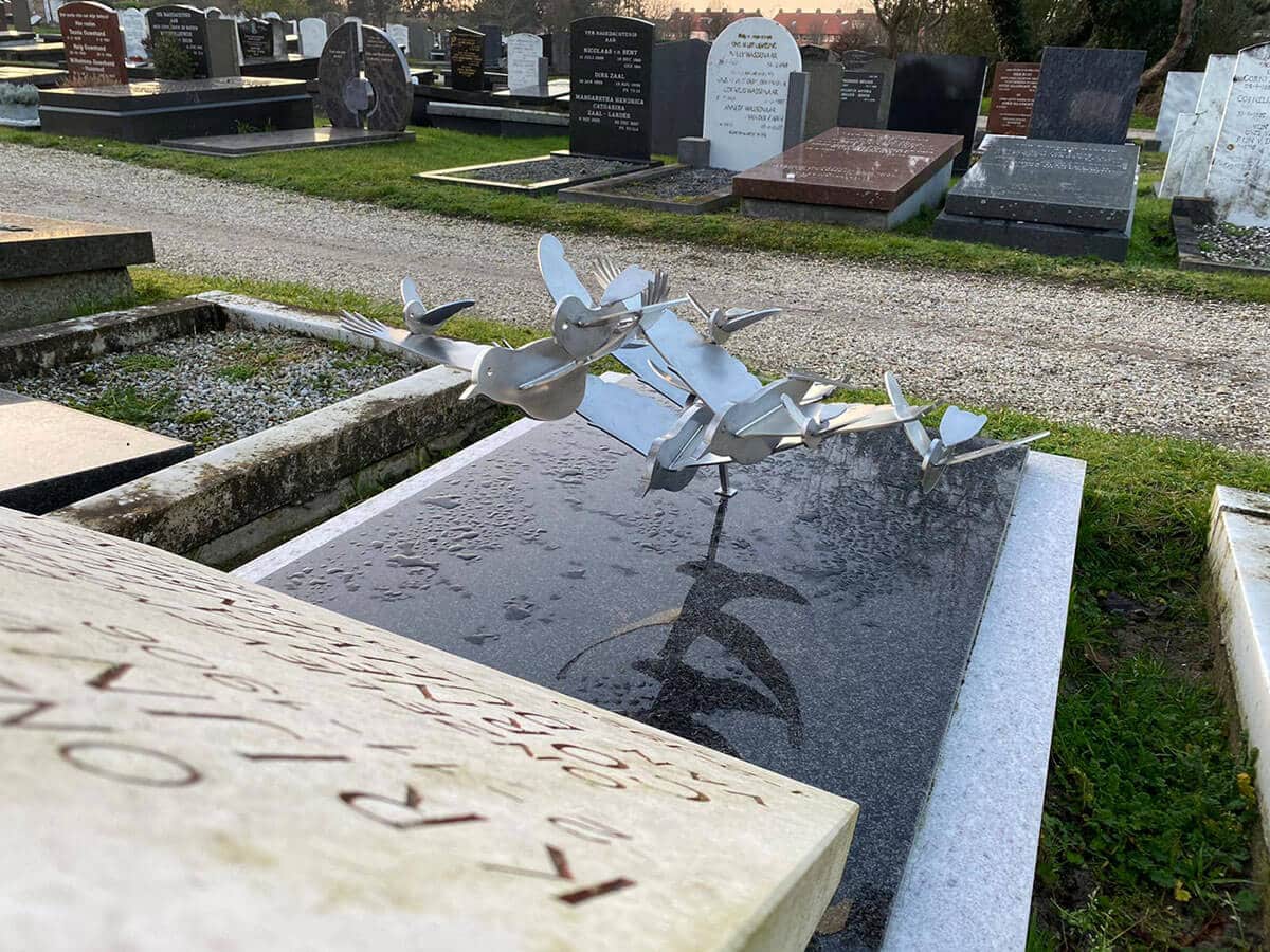 Voor een al bestaand familiegraf ontwierp ik in overleg met de nabestaanden deze vlucht van vogels. De vogels hebben voor de nabestaanden een speciale betekenis. Ieder vogeltje staat symbool voor iemand. De combinatie van oud en nieuw is verrassend en verfrissend. Het contrast met de grafstenen op de traditionele begraafplaats in Katwijk is duidelijk.