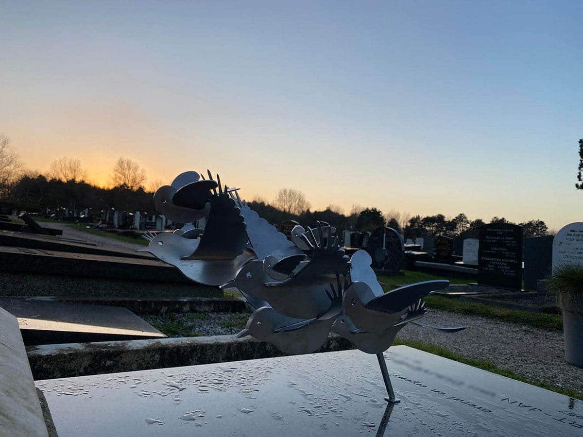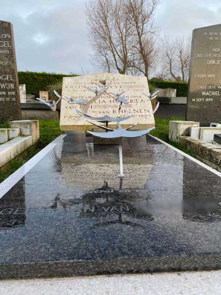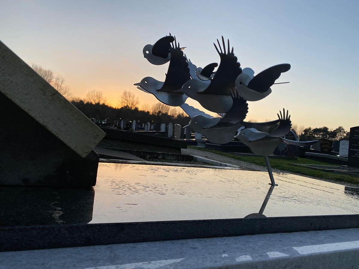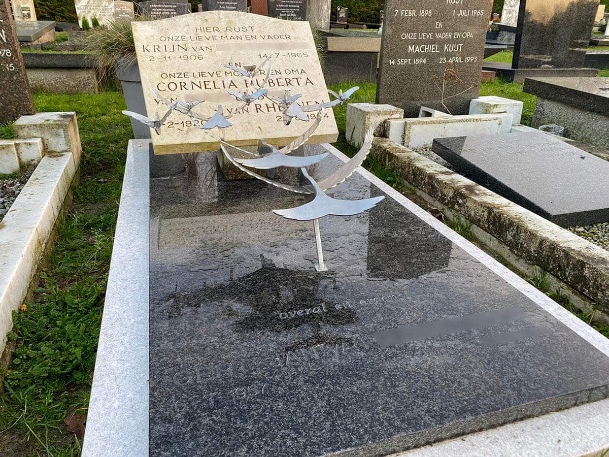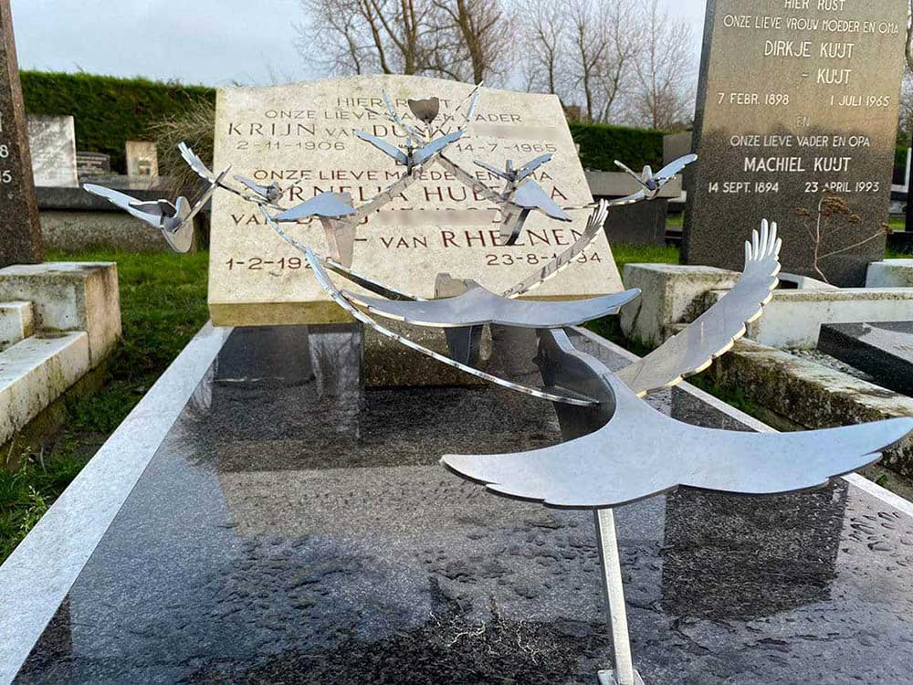vlucht van vogels van RVS op bestaande grafsteen van familiegraf