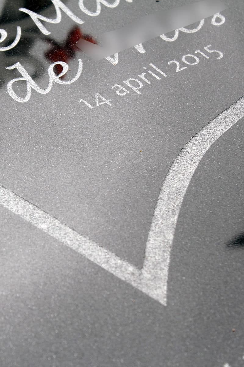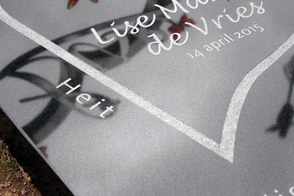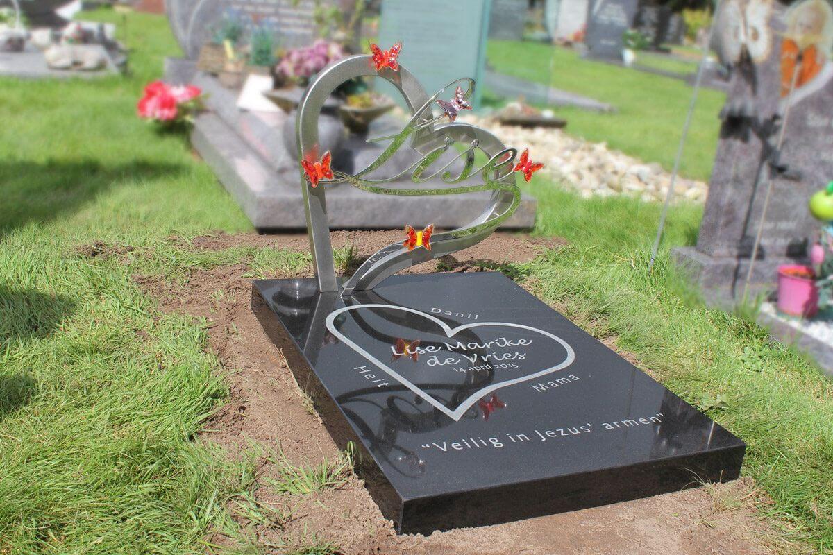 Het hart staat op een zwarte steen die enigszins spiegelt. In de steen is een hart gegraveerd met daarin de naam van Lise. Daaromheen staan de namen van de ouders en het broertje. De spreuk “Veilig in Jezus’ armen” maakt het compleet.