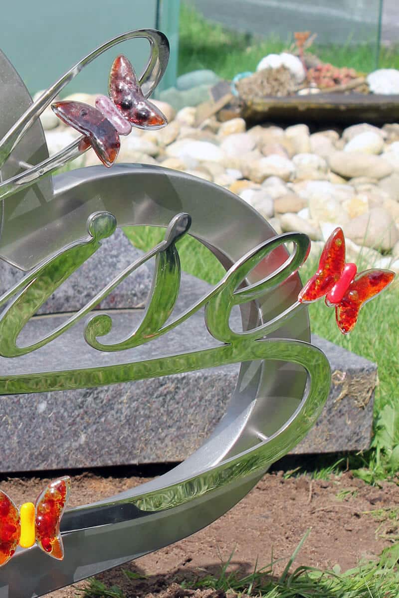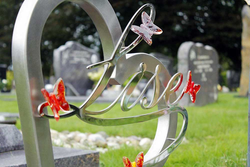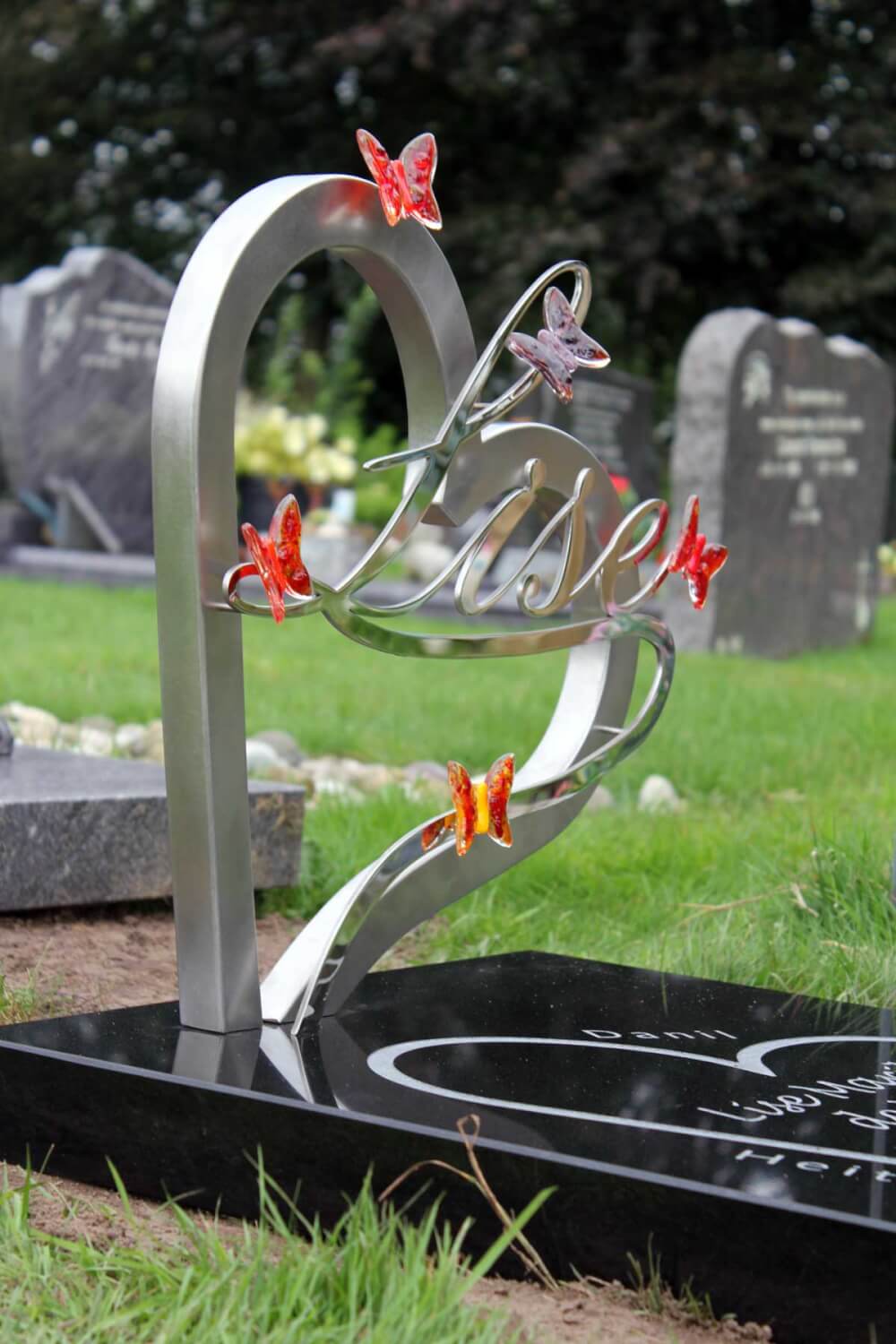In het ontwerp wilde ik de gemeenschappelijke elementen verbeelden en zo de verschillende wensen met elkaar verbinden. Het ontwerp voor de gedenksteen baby met vlinders werd een licht en open hart met een wat ongebruikelijke vorm. Het hart draagt in lichte glanzende sierlijke letters de naam Lise met een lange krul. Daar omheen fladderen glazen handgemaakte vlindertjes in warme kleuren verwijzend naar het feit dat Lise een vlinderkind was.