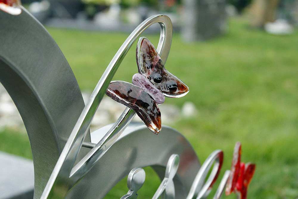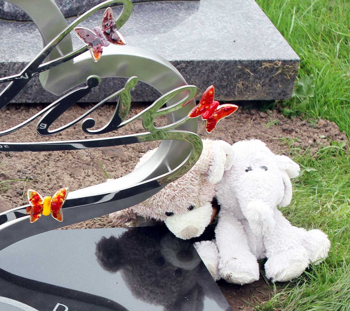 Het is een kleurrijk en licht kindergrafje met vlinders van mooi en kleurrijk glas geworden. Mooi en gevoelig. Op de begraafplaats valt het op tussen de meer traditionele kindergrafstenen.