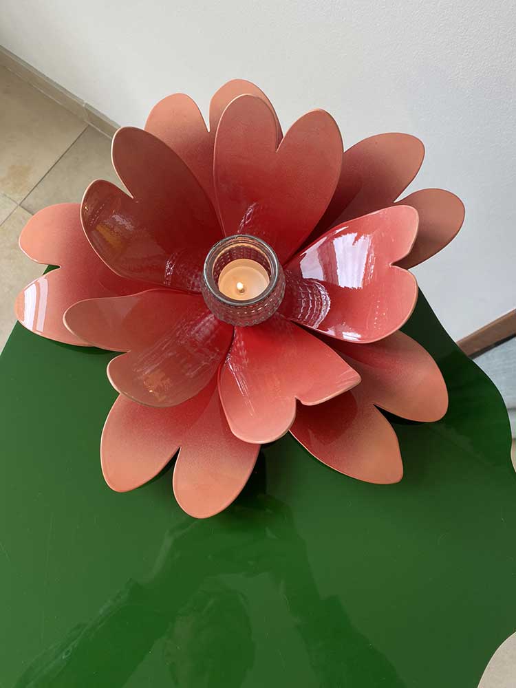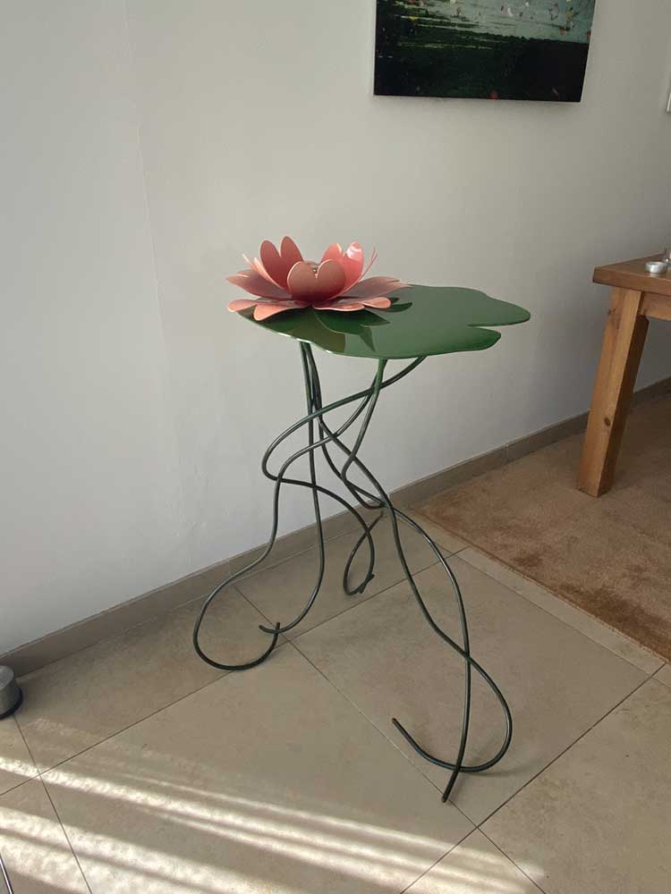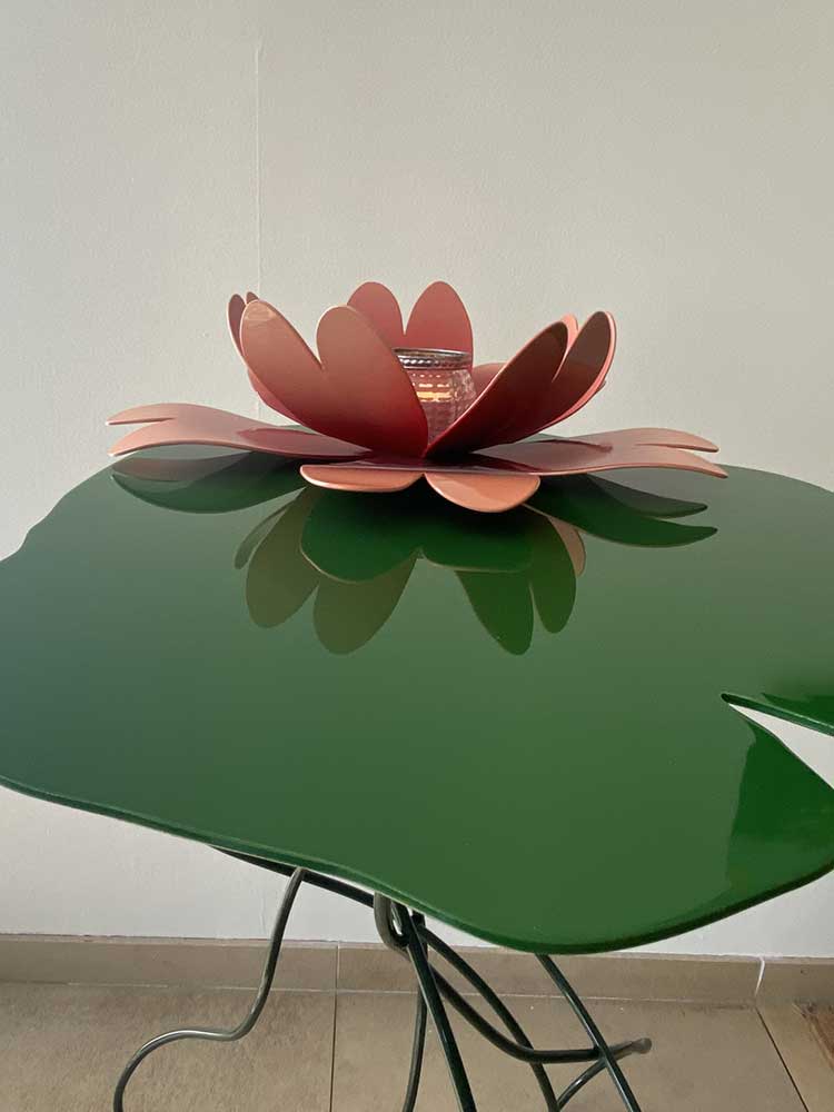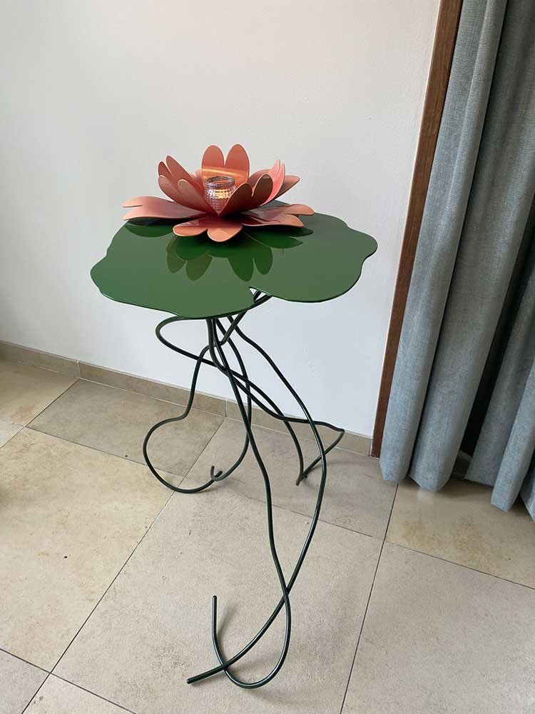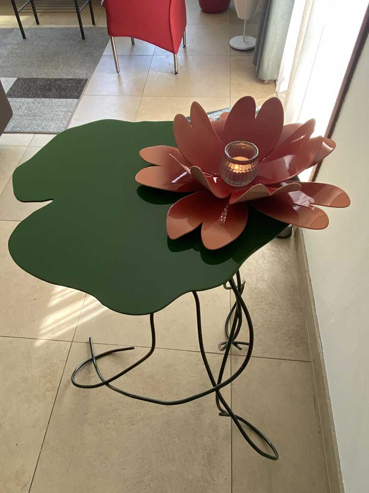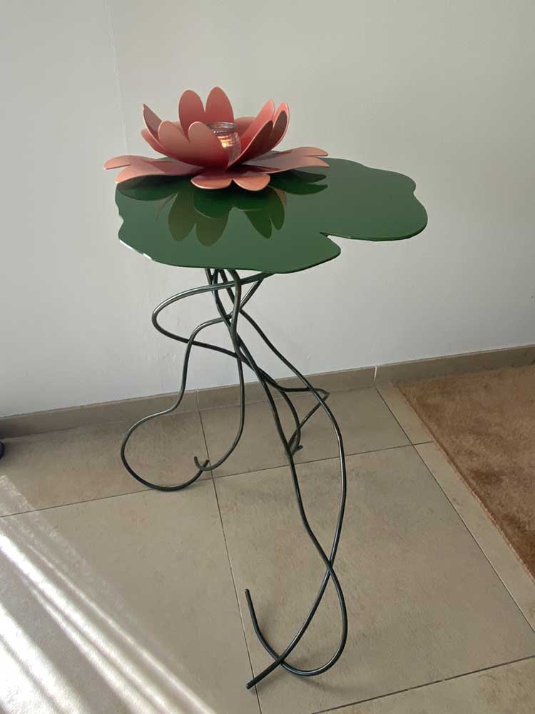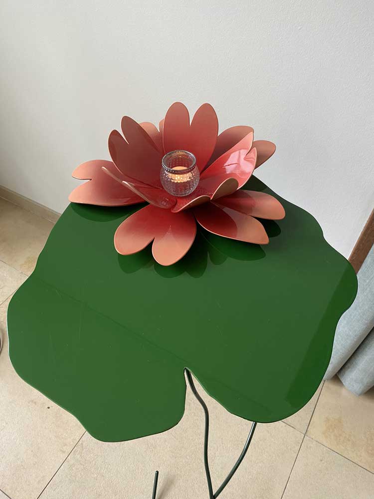 Na het overlijden van een dierbare wil je de mooie herinneringen aan je dierbare koesteren en levend houden. Een gedenktafel biedt de mogelijkheid om thuis een persoonlijk gedenkplekje te creëren, met ruimte voor foto’s, kaarten, bloemen en een kaarsje of lichtje. Onze gedenktafel, ontworpen in de vorm van een waterlelie, combineert esthetiek met functionaliteit. Het groene blad, dat normaal op het water drijft, dient als tafelblad. De bloem biedt ruimte voor een lichtje of lampje, terwijl de poten de vorm van wortels aannemen. Dit speelse en elegante tafeltje is een aanwinst voor elk interieur.