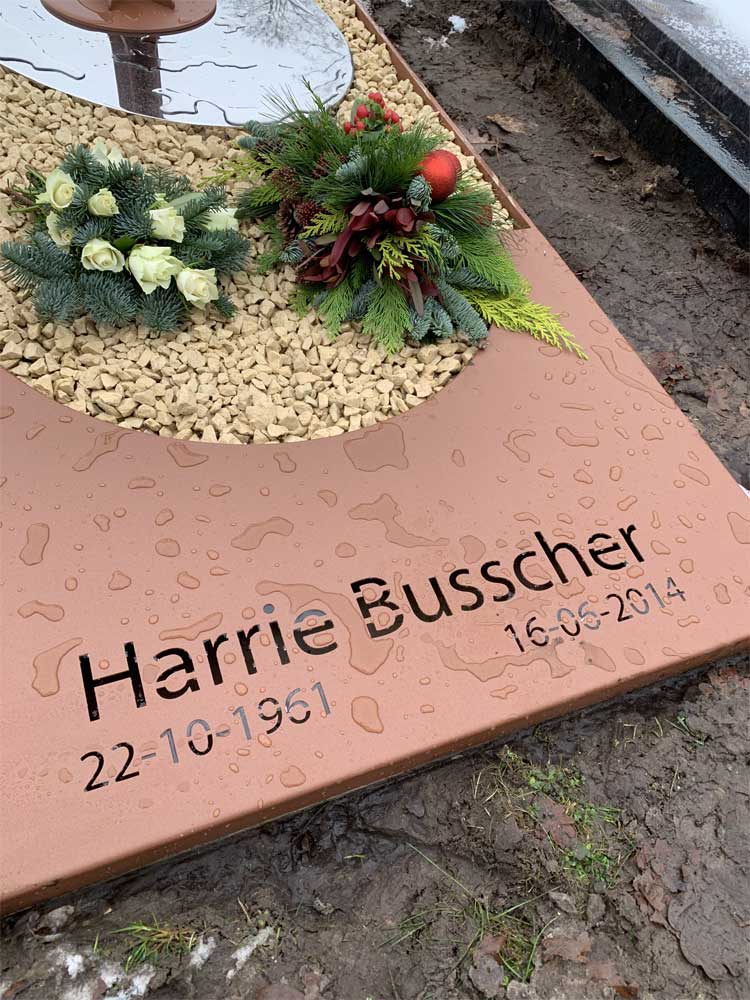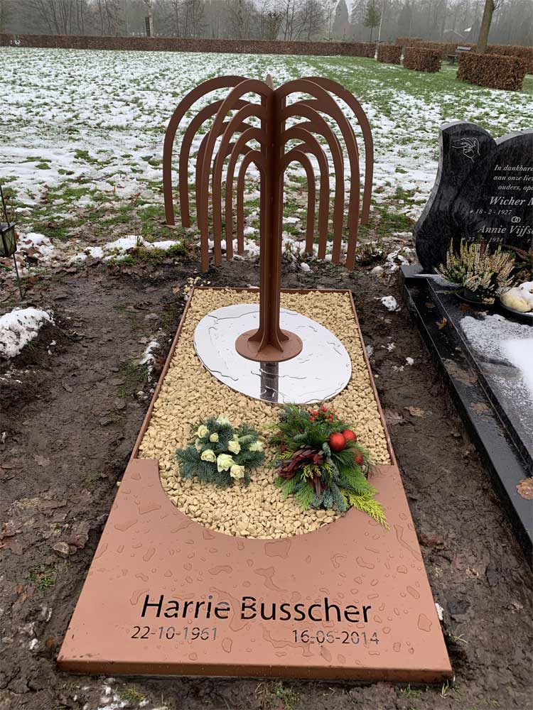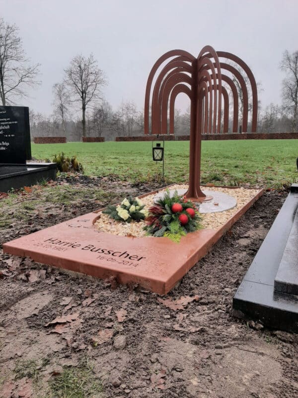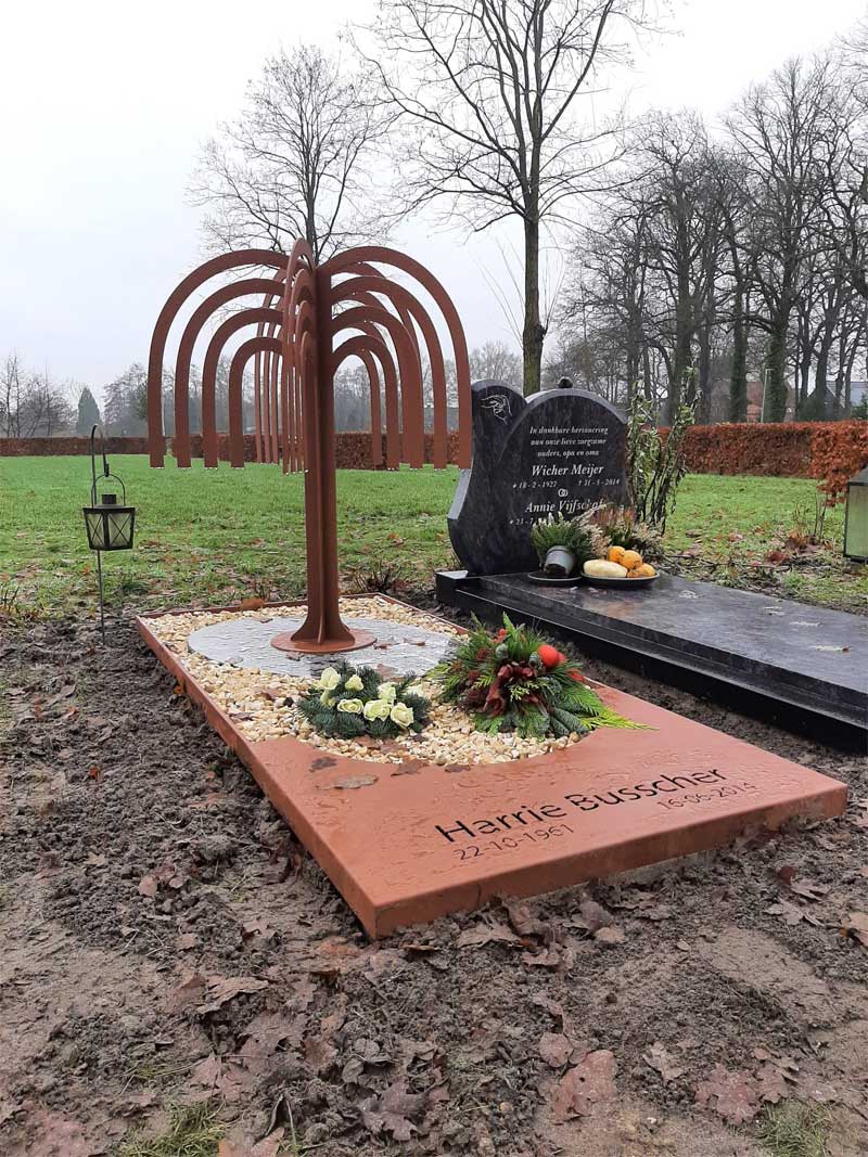 Een bijzonder grafmonument in cortenstalen look RVS met een prachtige gestileerde boom voor Harrie.