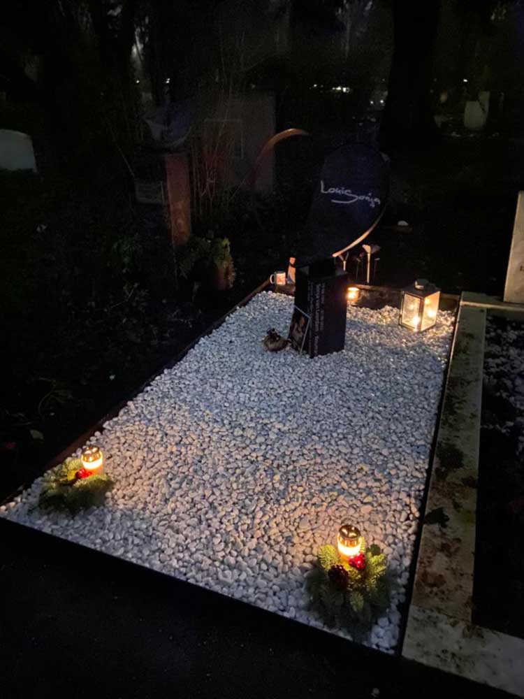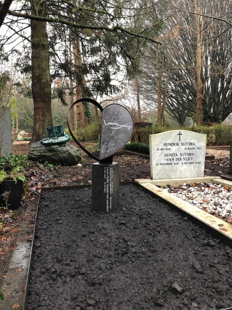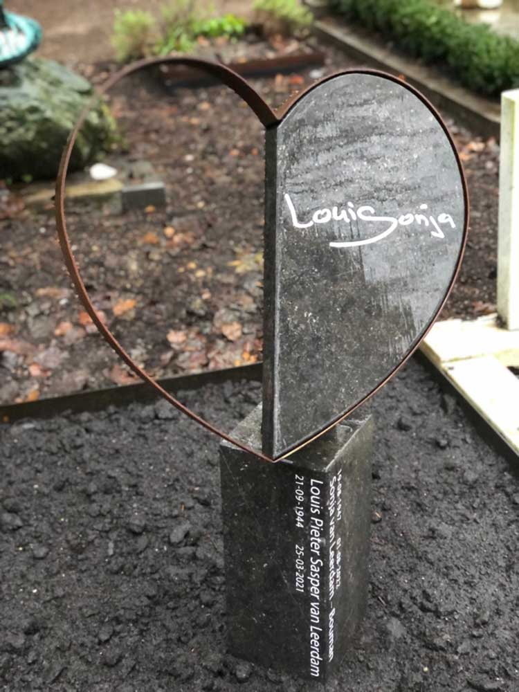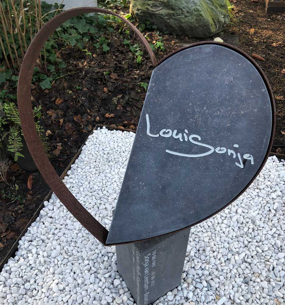 In het grafmonument is de naam van Louis in het handschrift van Sonja gegraveerd. De naam van Sonja zal er later bij komen. Dan graveren we achter “LouiS” nog “onja” zodat er “LouiSonja” komt te staan.