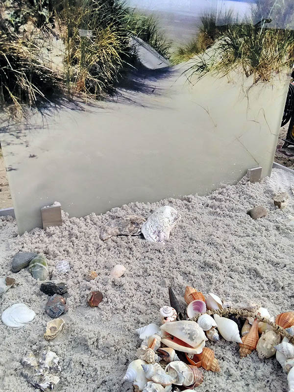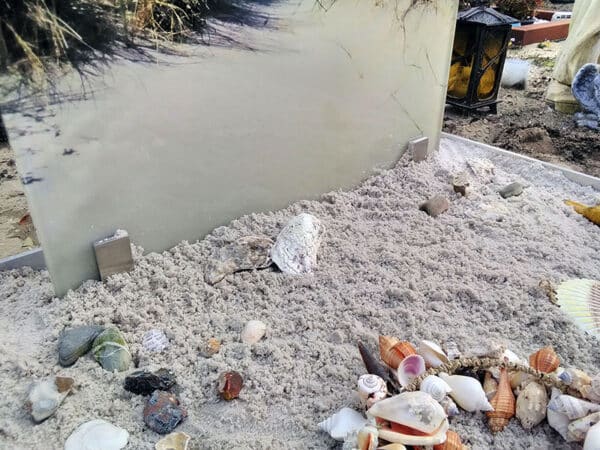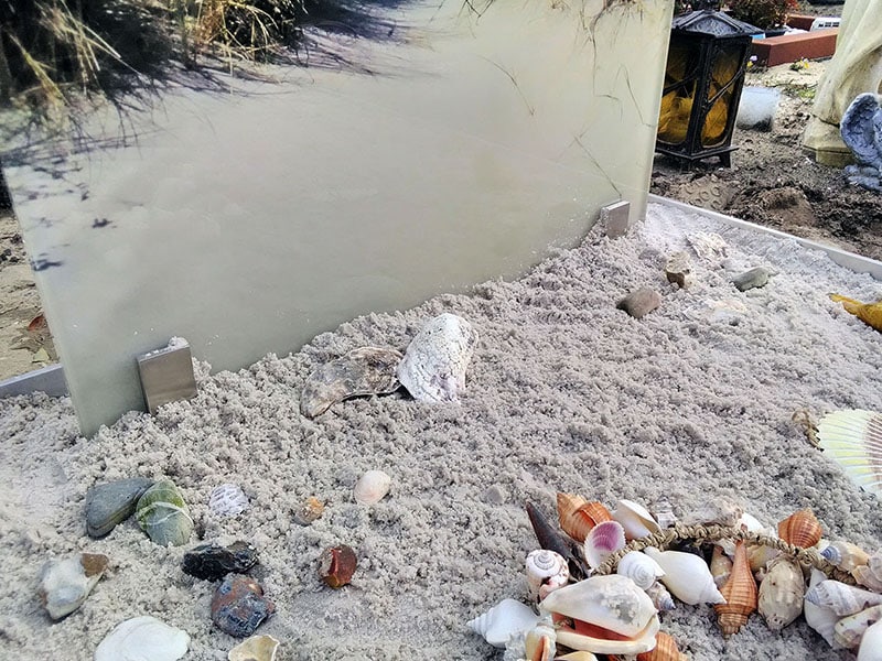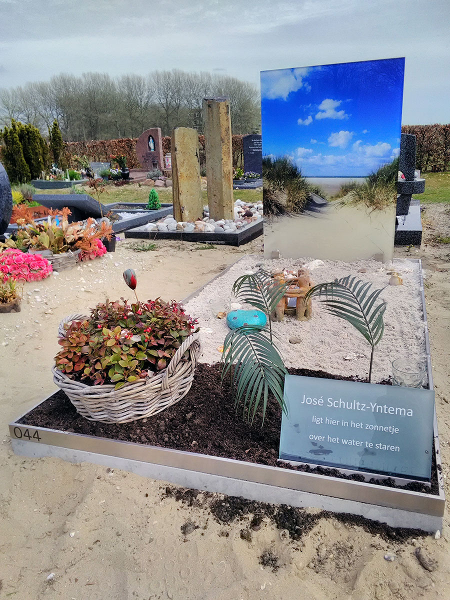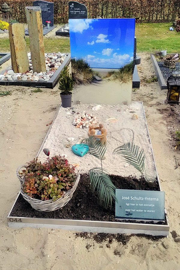 De glazen grafsteen bevat een grote kleurenfoto van een zonnig strand, een favoriete plek van de overledene. De foto loopt naadloos door in een laag zand en schelpen voor het graf. Dit geeft het monument een natuurlijke uitstraling en versterkt de symboliek van rust en verbinding met de natuur.