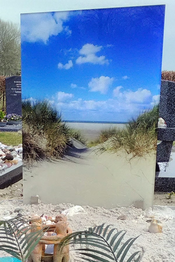 De foto zit aan de achterzijde van het glas en is beschermd tegen uv-licht en weersinvloeden. Zo blijft de afbeelding jarenlang helder en kleurrijk. De naam en data zijn subtiel gegraveerd op een apart glazen plaquette, zodat de foto volledig tot zijn recht komt.