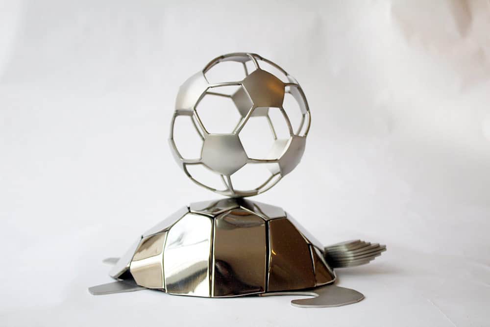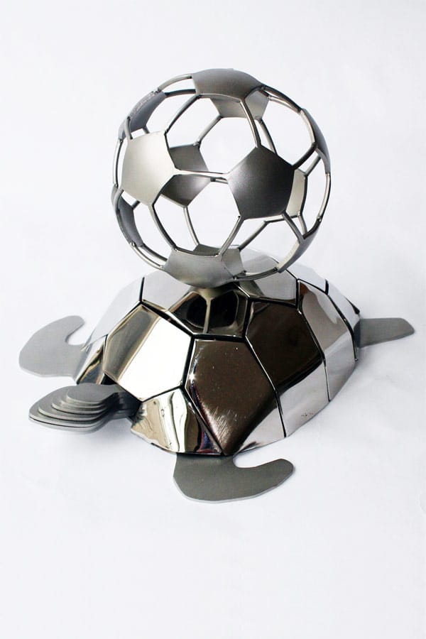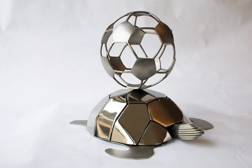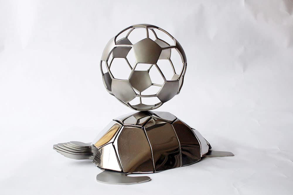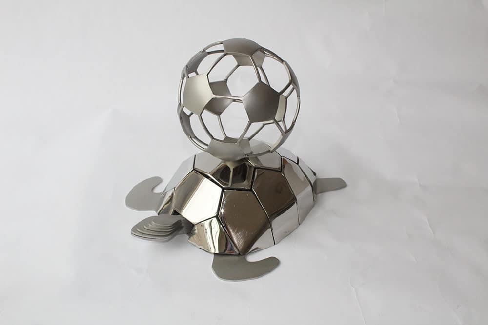 Het RVS van het schildpadje is gepolijst en het voetballetje is gematteerd (keramisch gestraald). Al het gebruikte RVS (inox) is RVS316.