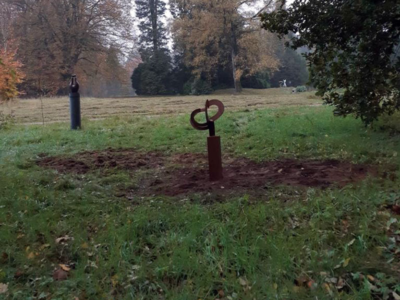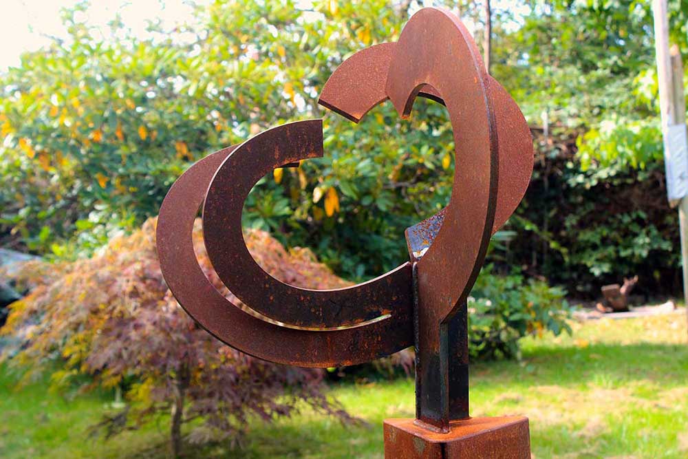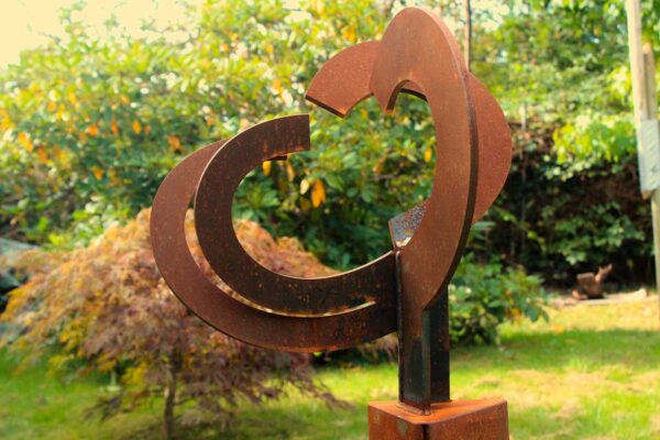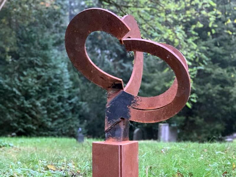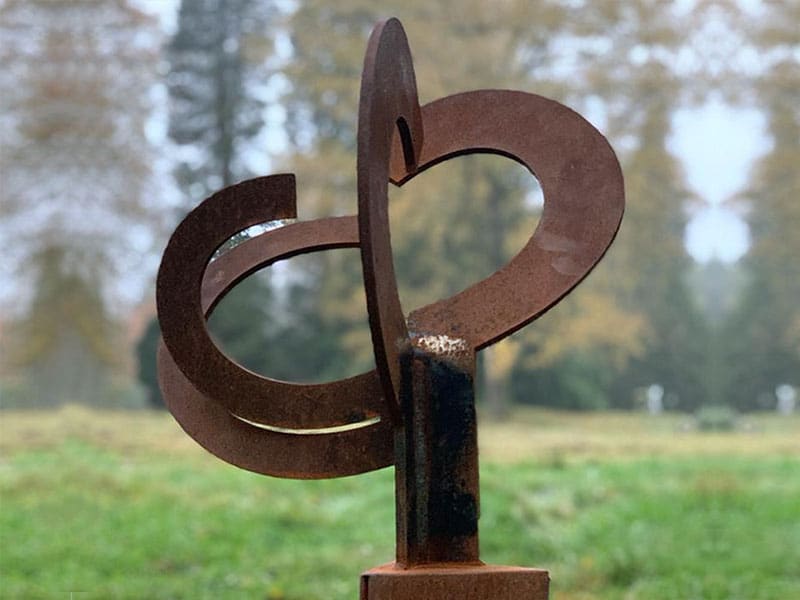 Op verzoek van de dochter ontwierp ik dit bijzondere gedenkteken voor haar vader. Het materiaal is geroest staal. Het ontwerp verbeeldt op liefdevolle en treffende wijze de situatie en geschiedenis van de dochter en haar vader en moeder. Het robuuste gedenkteken is van dik staal dat kracht én een wankel evenwicht verbeeldt. Behalve kracht en balans vormen de halve cirkels met elkaar onder een bepaalde hoek een hart. Het beeld is uitgevoerd in 10mm dik cortenstaal dat in de loop van de tijd zal roesten. De krachtige uitstraling van deze grafkunst sculptuur doet Spaans aan.