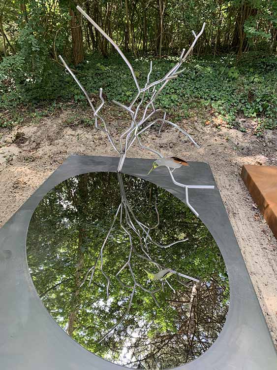 Een kunstzinnig gedenkteken van RVS en cortenstaal met een boompje, vijver en ijsvogeltje voor een overleden vader en echtgenoot.