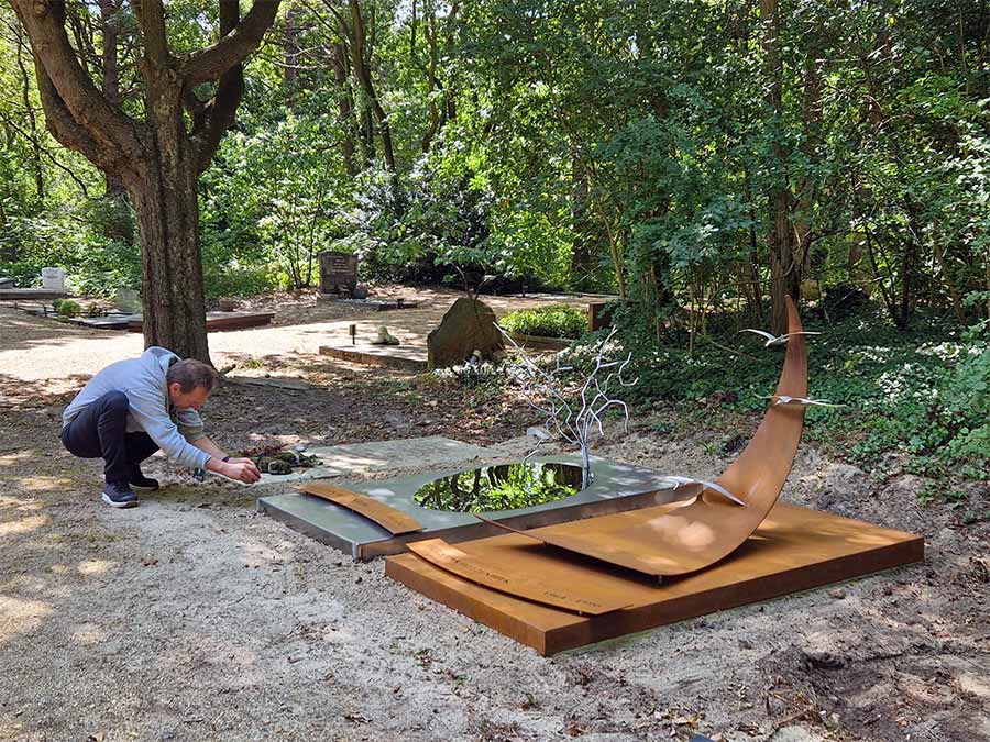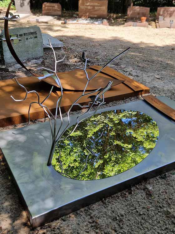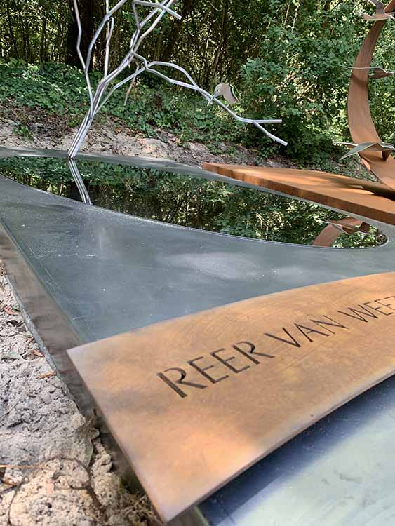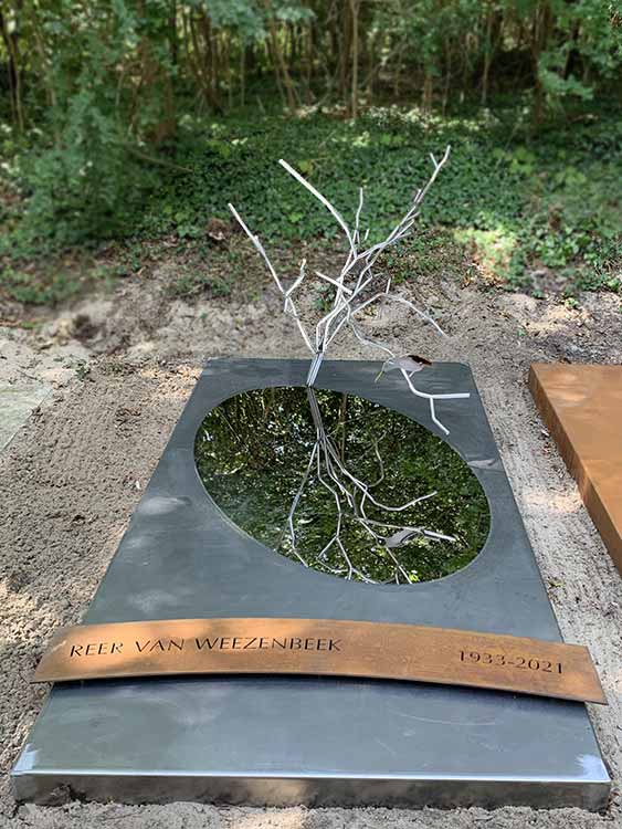 Op het graf moest een bijzonder en uniek gedenkteken komen dat passend was voor Reer. Als materiaal voor het grafmonument ging de voorkeur in eerste instantie uit naar geroest cortenstaal vanwege de natuurlijke uitstraling. Al pratende kwamen we op het idee om water te verbeelden met gepolijst RVS en cortenstaal. Een ijsvogel krijgt daar een mooie centrale rol in. Eventueel in een “levensboom” aan het hoofdeinde.