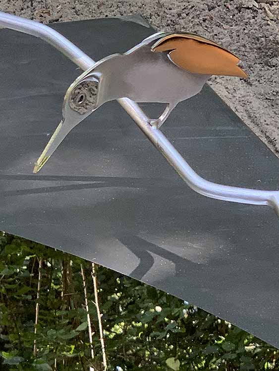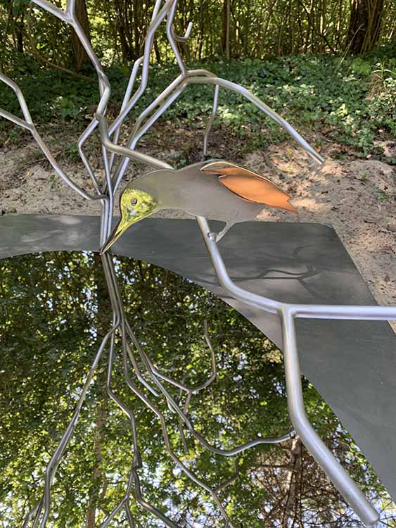 Het ijsvogeltje is met zorg gemaakt en deels gepolijst en deels geschuurd. De kleuren in het vogeltje zijn reflecties van de omgeving.