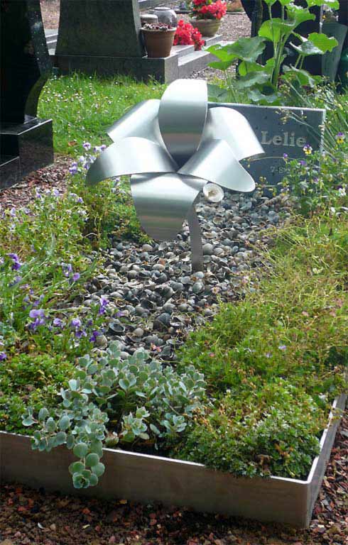 Een artistiek en ingetogen RVS grafmonument op de begraafplaats. Het graf is begrensd met een roestvrij stalen rand. Binnen dit kader liggen schelpen en is beplanting aangebracht. Centraal op het graf staat de heldere RVS lelie. Deze verbeeldt de familienaam die op een bescheiden granieten grafsteentje staat en verschillende plantjes completeren dit bijzondere grafmonument.