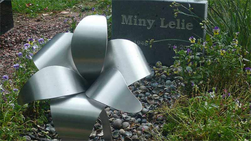 Op het graf van hun moeder wilden de nabestaanden graag een bijzondere lelie van RVS. De artistieke en elegante lelie van roestvast staal verwijst naar haar achternaam en staat duidelijk zichtbaar op het graf. Aan het hoofdeinde staat een klein subtiel steentje met de naam en datums. Het graf kreeg een kader van geslepen RVS. Deze omkadering begrenst op eenvoudige wijze het graf en is een mooie omkadering van de beplanting.
