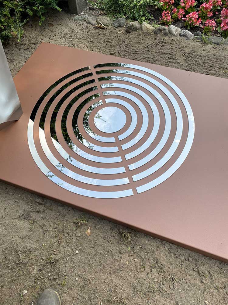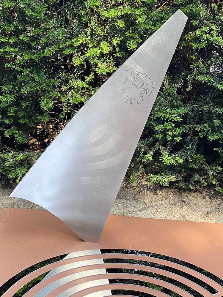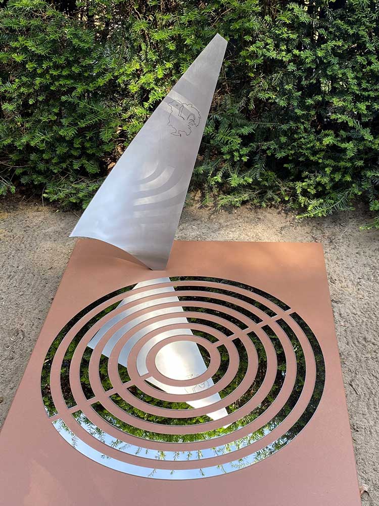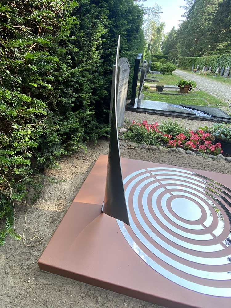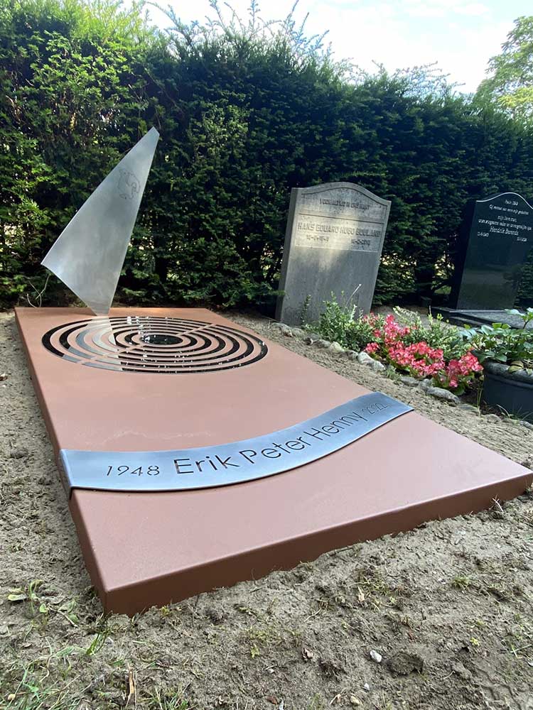 Het prototype gaf een goede indruk. Het zeil kreeg een iets andere positie en het lint werd iets verplaatst. Toen dat akkoord was konden we het gedenkteken in het definitieve materiaal gaan uitvoeren. In plaats van cortenstaal werd gekozen voor RVS dat in een cortenstalen look werd gepoedercoat. Voordeel daarvan is dat het gedenkteken in 1x de gewenste kleur heeft en mooi egaal van kleur is. Tevens blijven de RVS onderdelen op de grafzerk (het zeil, de ringen en het lint met de naam) roestvrij. Het roesten van het cortenstaal kan in het begin wat afgeven op het RVS. Niet onoverkomelijk want het kan eenvoudig verwijderd worden, maar wel een extra werkje dat hiermee werd voorkomen.
