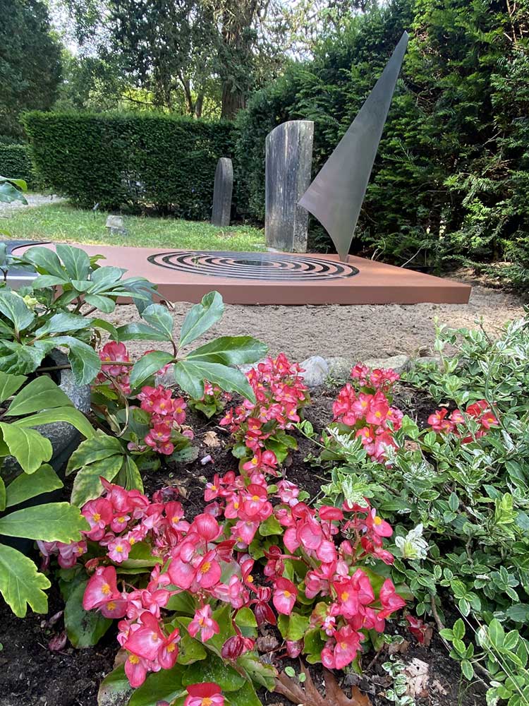 Op een zonnige dag plaatsen we het monument op de mooie begraafplaats Nieuw Valkenveen in Naarden. Een paar dagen daarvoor was al een betonnen fundering geplaatst waar de grafzerk op rust. Het grafkunst gedenkteken staat op een mooie plek en is in zijn omgeving een bijzondere toevoeging. Modern en subtiel opvallend met de weerspiegeling van het zeil en de natuur en de hemel in de watercirkels. Zoals Anja zei: “Heel krachtig en toch subtiel”.