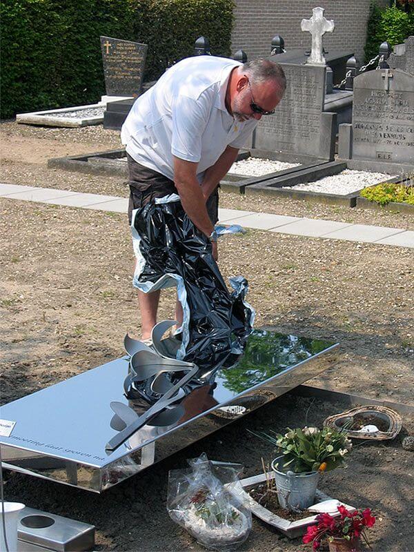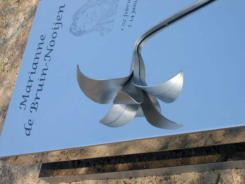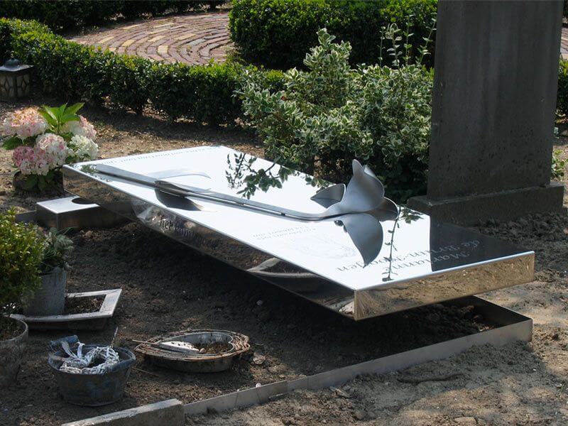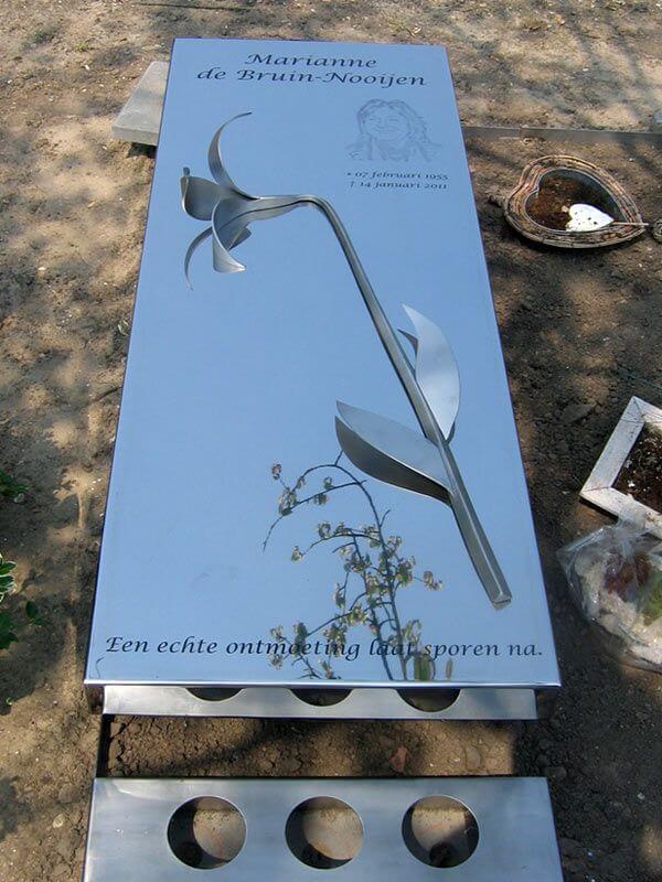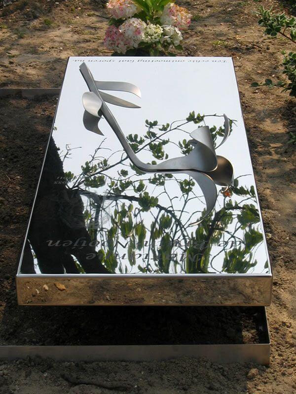 Het eigentijdse grafmonument met lelie voor Marianne bestaat uit een RVS plaat die gepolijst is als een spiegel. De plaat lijkt visueel te zweven door de poten eronder niet zichtbaar zijn. De plaat spiegelend roestvrij staal hemel weerspiegelt de hemel. Je ziet de wolken voorbij drijven en ook flitst af en toe een vogel voorbij.