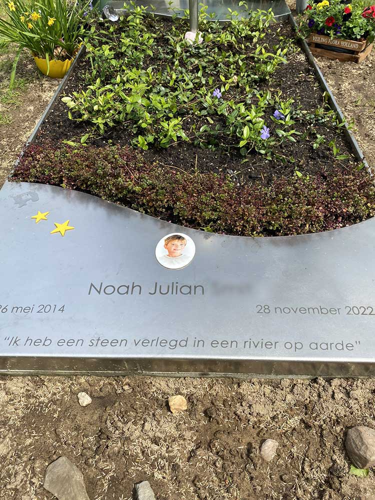 Op een natte dag plaatsen we samen met de familie het grafmonument voor Noah op de mooie begraafplaats in Laren. Een intensief en emotioneel traject werd daarmee voltooid.