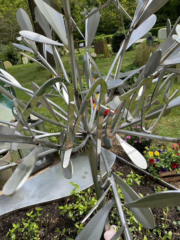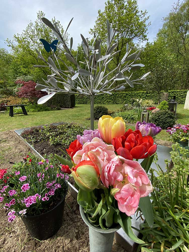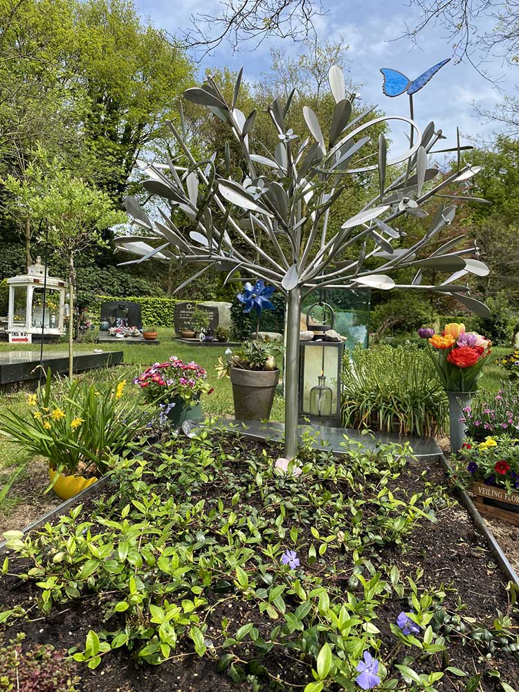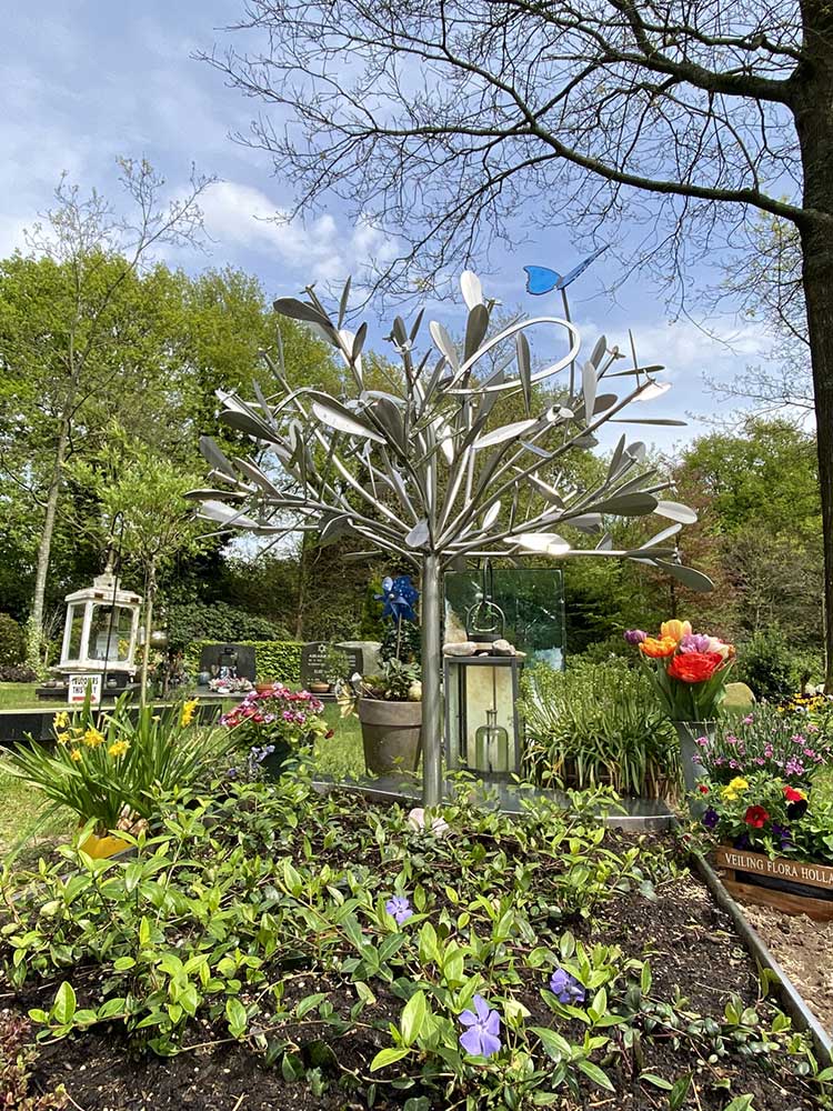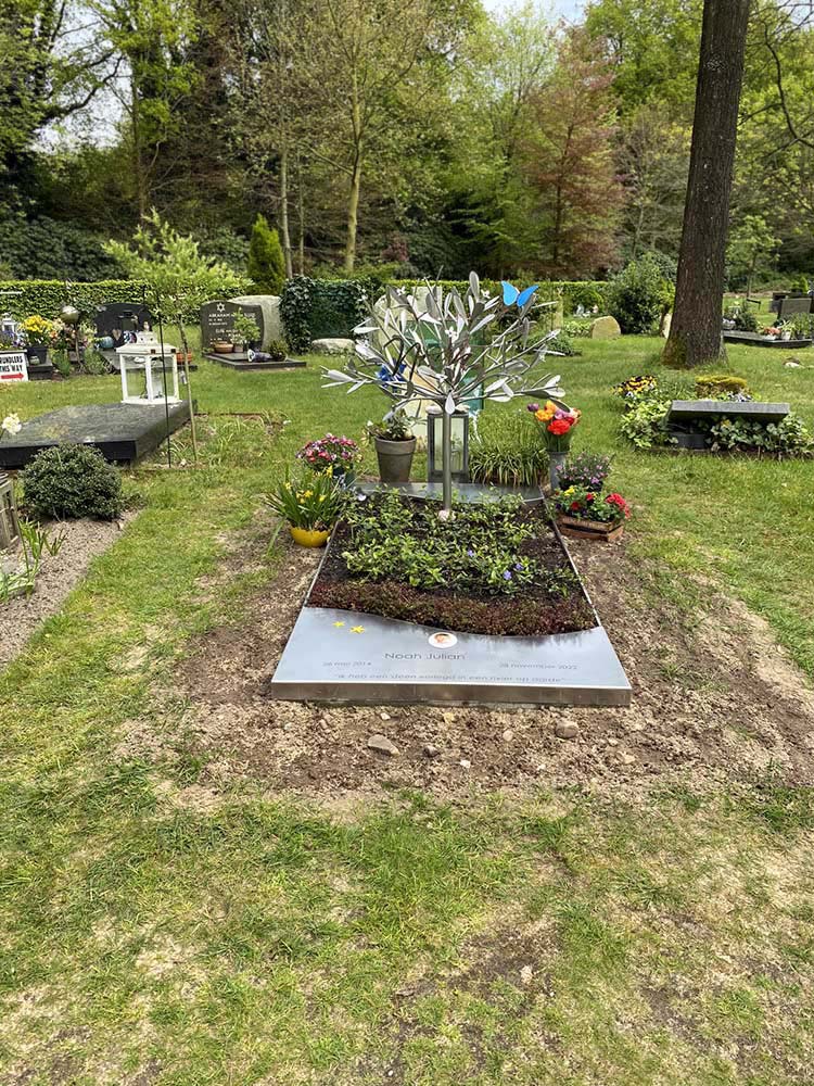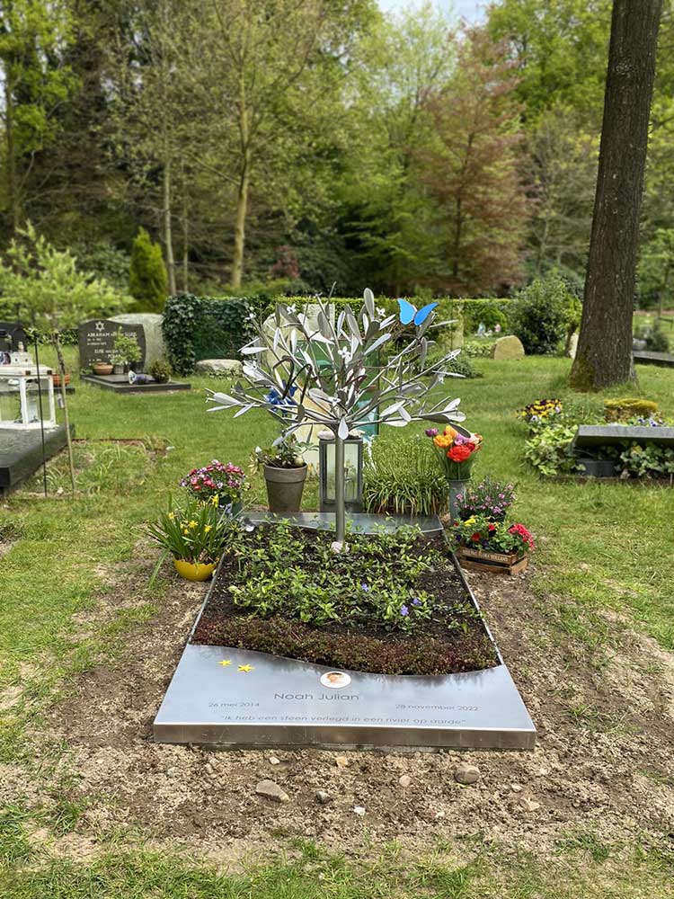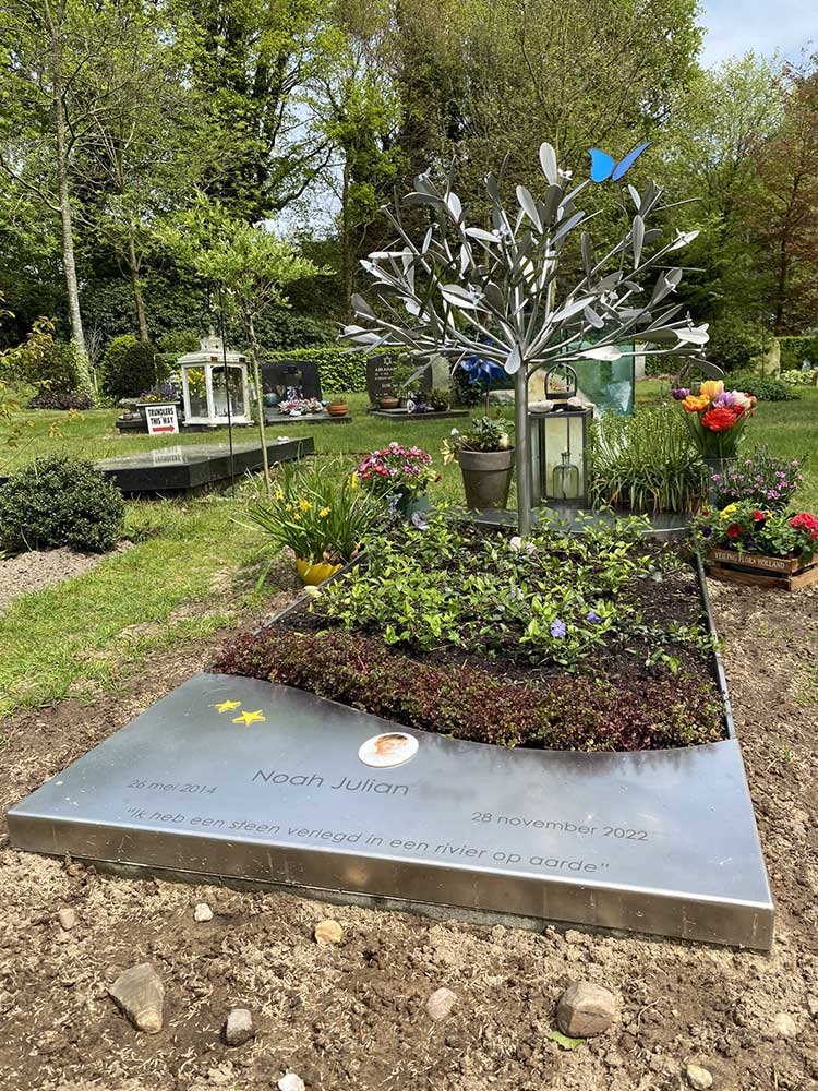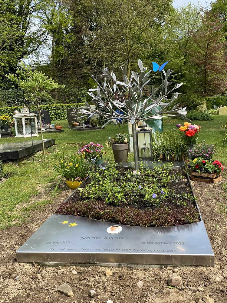 Op verzoek van de ouders van Noah ontwierp ik een olijfboompje ter ere van en als gedenkteken voor hun zoon Noah. In het grafmonument kwam een prachtige blauwe vlinder die voor de ouders en voor Noah belangrijk was geweest.