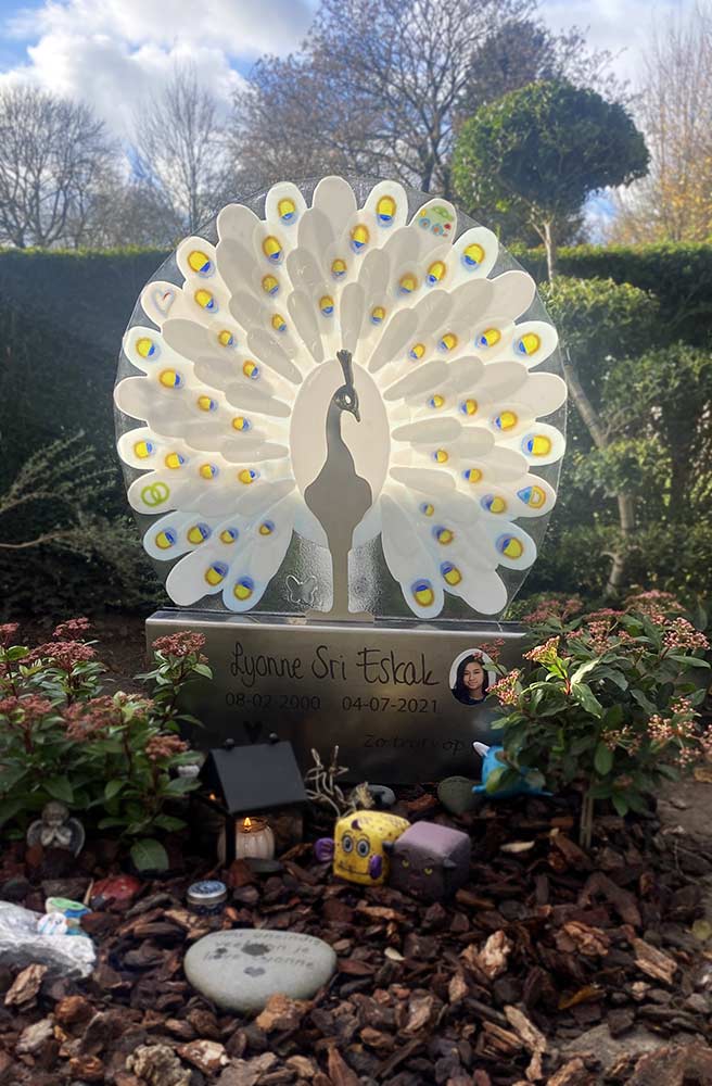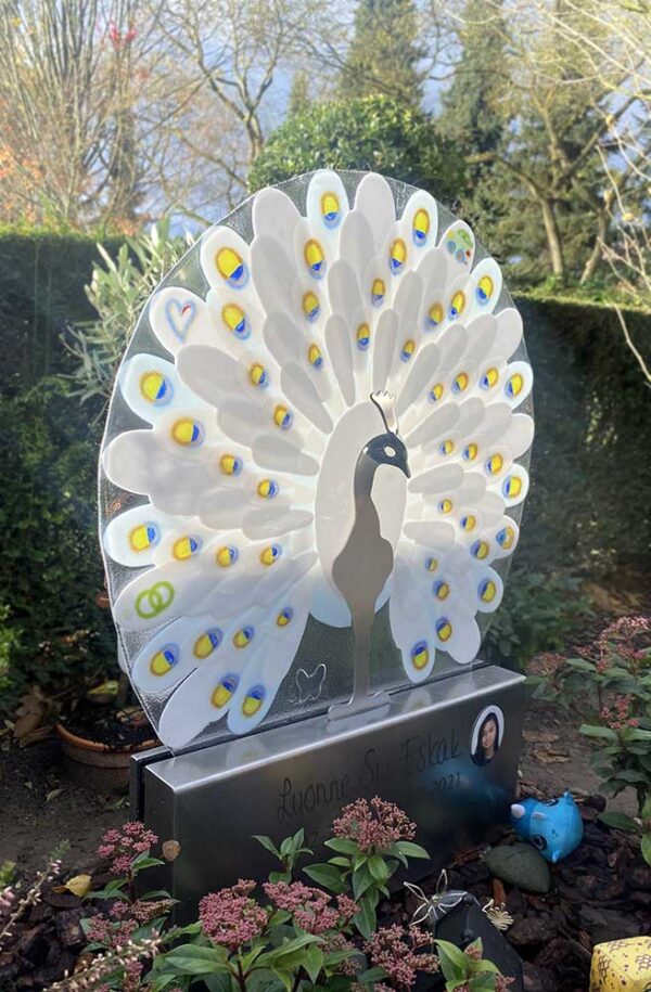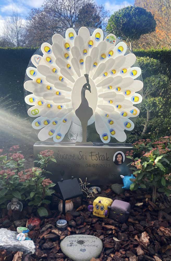Dit glazen grafmonument met een pauw is uniek en bijzonder. Het is een eerbetoon aan Lyonne. Met haar favoriete kleuren, persoonlijke details zoals haar handschrift, en een prachtige combinatie van glas en RVS, straalt het monument schoonheid en liefde uit. Het maakt een bijzondere plek om haar te herinneren en trots te zijn op wie zij was.