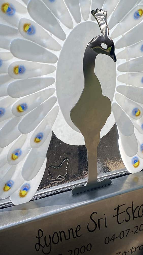 Een deel van het grafmonument is van RVS gemaakt. Hierin wordt de glazen pauw vastgeklemd. Op de de RVS voet staat de naam in het eigen handschrift van Lyonne en is een mooie foto bevestigd.