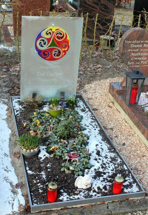 Voor Stef had de “Triskel” – een eeuwenoud symbool – een bijzondere betekenis. Helaas eindigde voor Stef het leven veel te vroeg. Hij had een bijzondere affiniteit met deze gekleurde cirkel. Het van oorsprong een Keltische symbool staat voor de drie-eenheid. In de triskel zitten drie kenmerkende spiralen. Die noemen ze ook wel de drie benen die symbool zouden staan voor het levensraad van geboorte en dood. Omdat dit symbool veel voor Stef betekende moest het op zijn glazen grafsteen komen.
