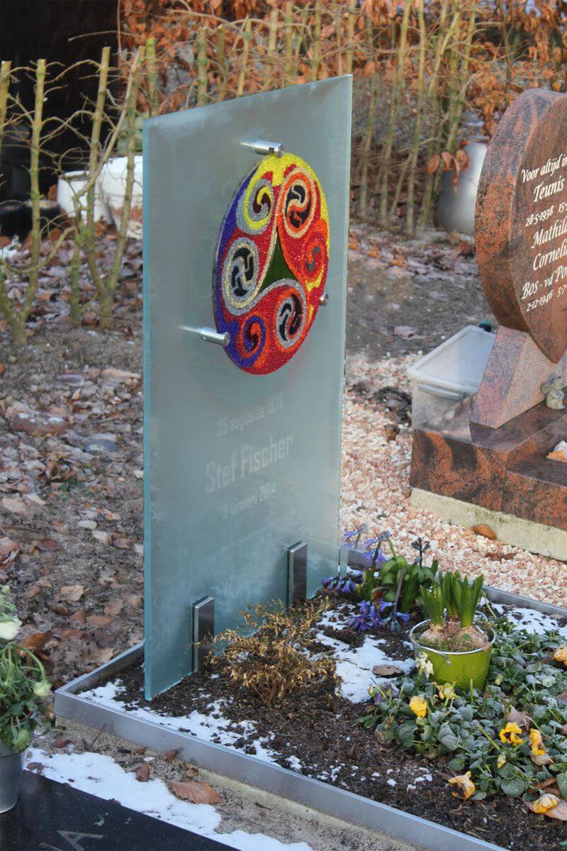 De ouders van Stef wilden voor het graf van hun zoon een glazen grafsteen met kleur: veel kleur! Liefst met Keltische symboliek.