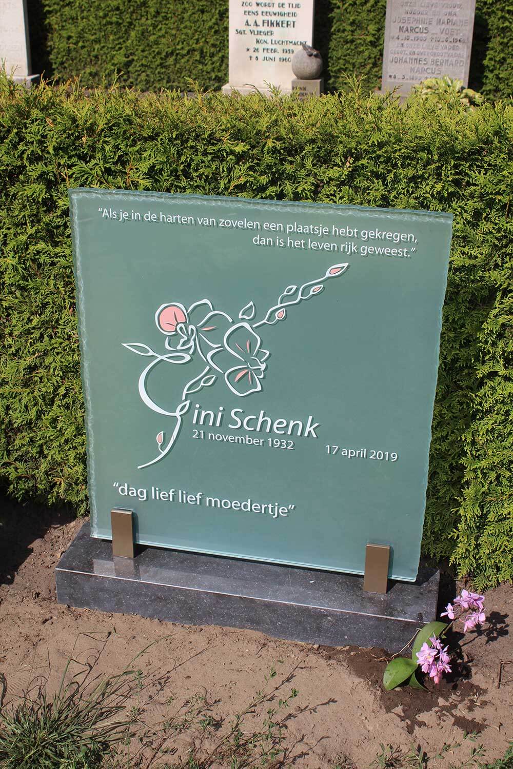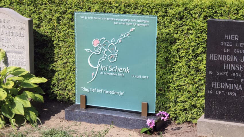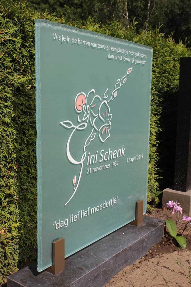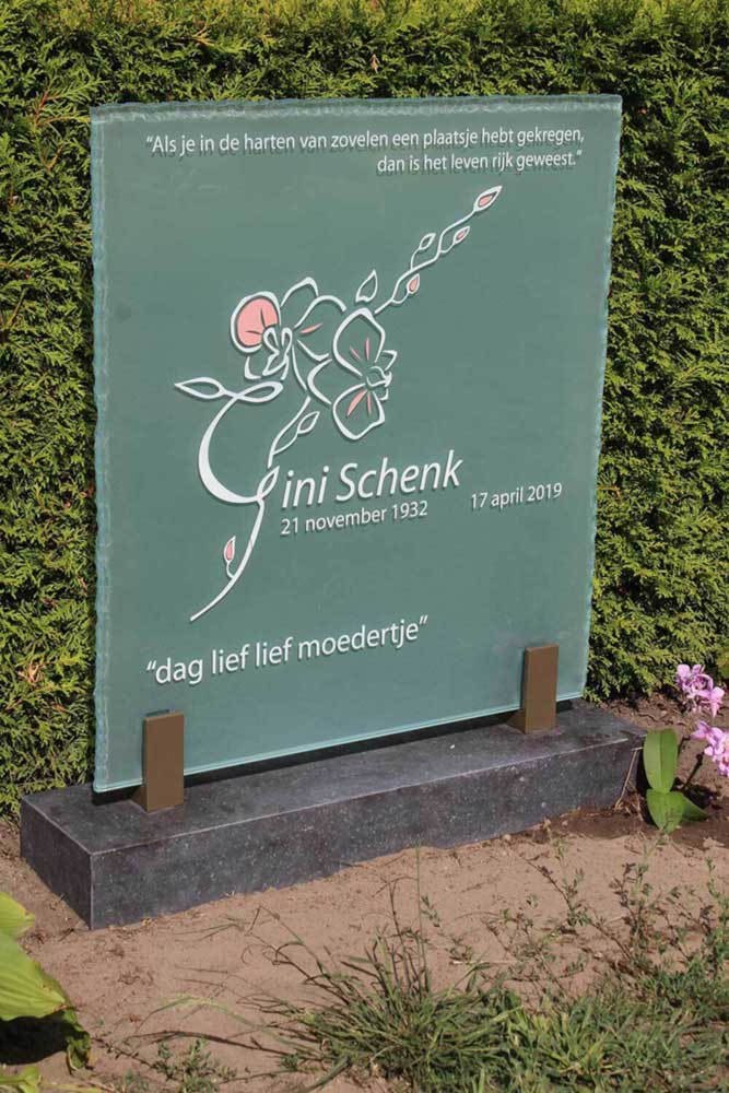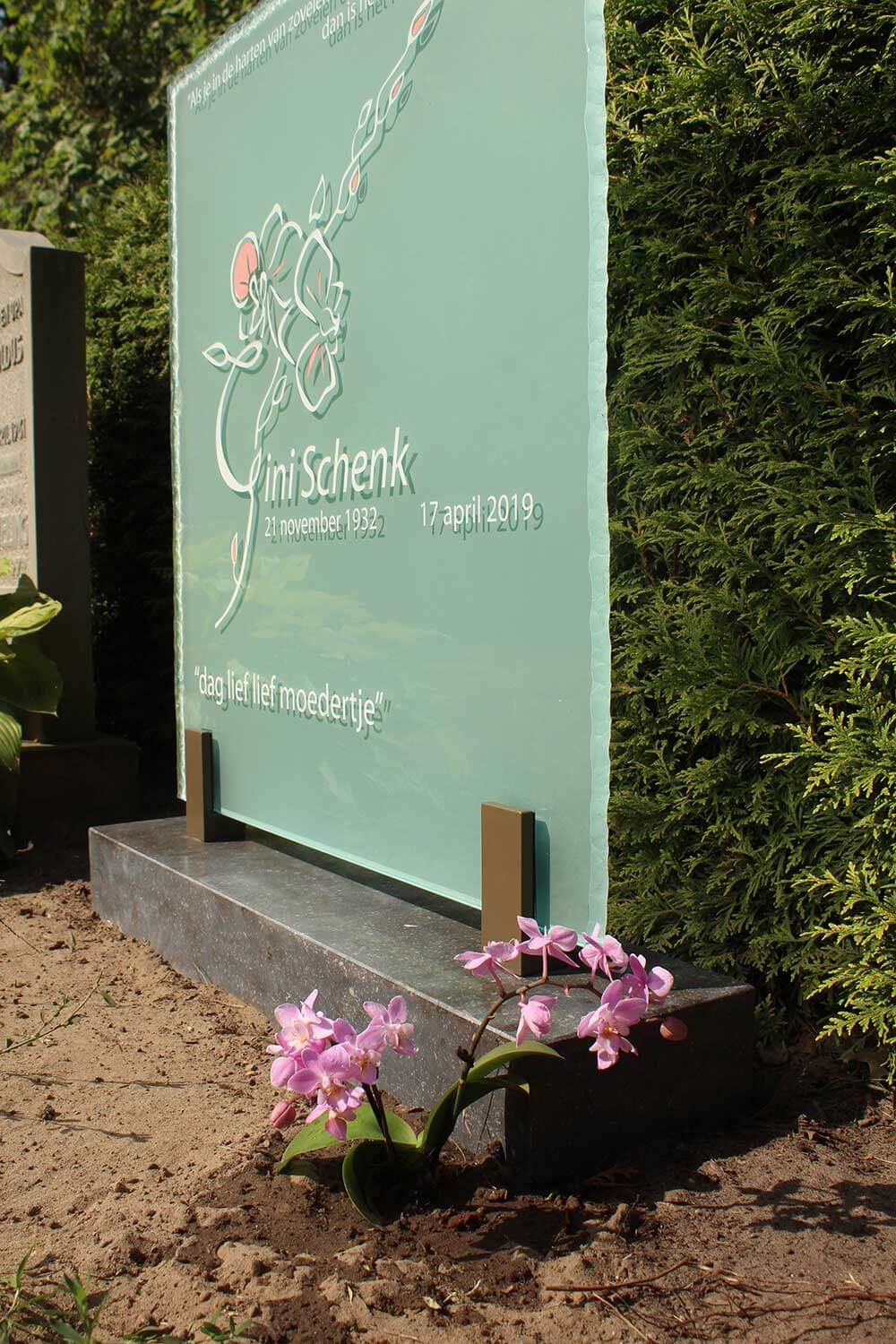 Het graf met het glazen grafmonument voor Gini staat op de begraafplaats in Almelo. Begraafplaats ’t Groendael aan de Willem de Clercqstraat 93 is een oude sfeervolle begraafplaats met een oud en nieuw gedeelte.