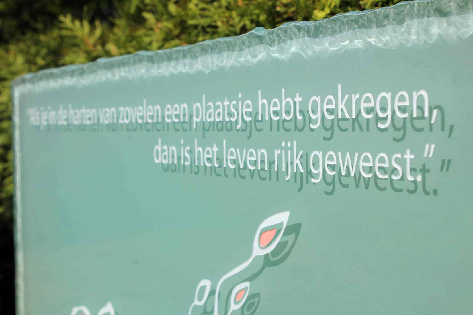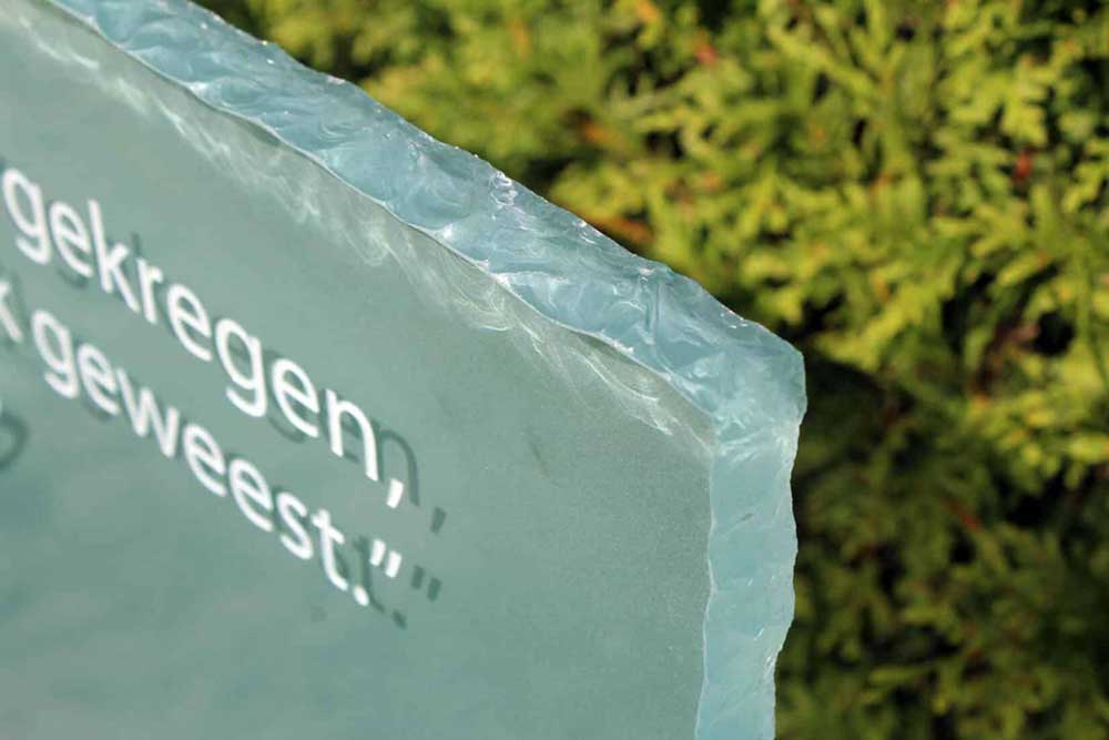 De nabestaanden wilden daarom een eenvoudige grafsteen van glas die verwees naar deze voor haar typerende bloem. Ook de rafelige rand die haar leven helaas gekend had mocht er in terug komen.