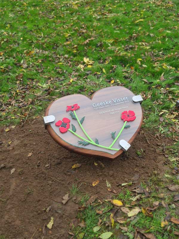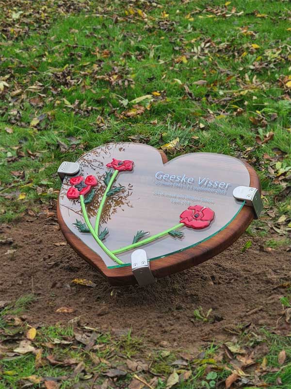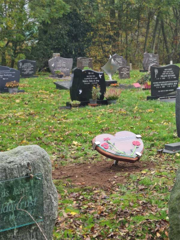 Roon en Esther kwamen naar mij toe met een houten hart dat Esther zelf had gemaakt als herinnering aan haar moeder Geeske. Hun wens was om dit bijzondere hart een plek te geven op het graf van hun moeder, op een kleine begraafplaats in het noorden. Samen gingen we aan de slag om een ontwerp te maken dat recht zou doen aan de liefde en herinnering.