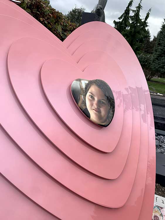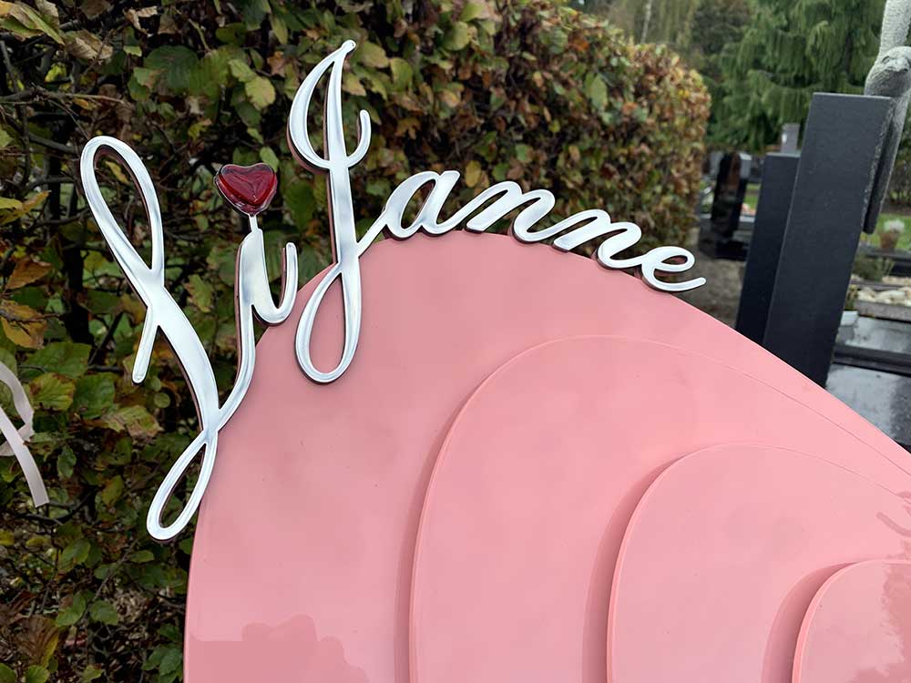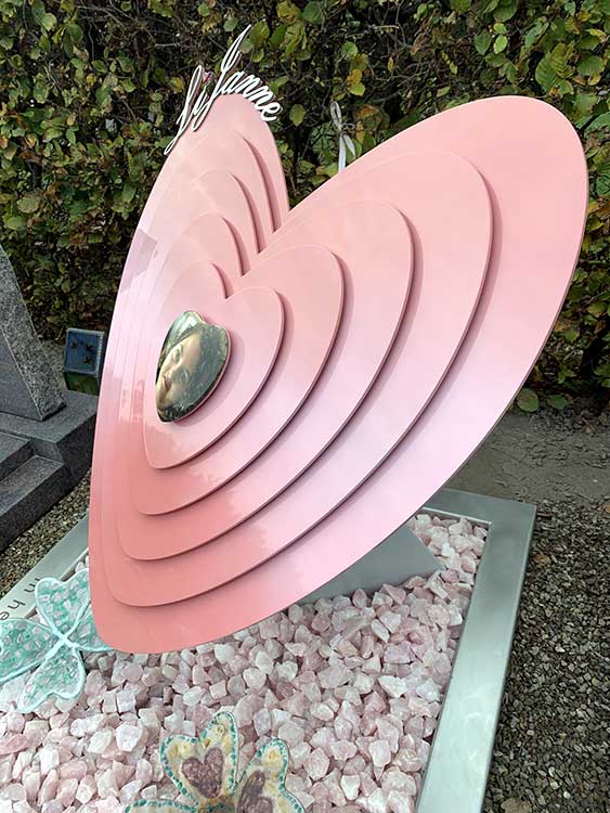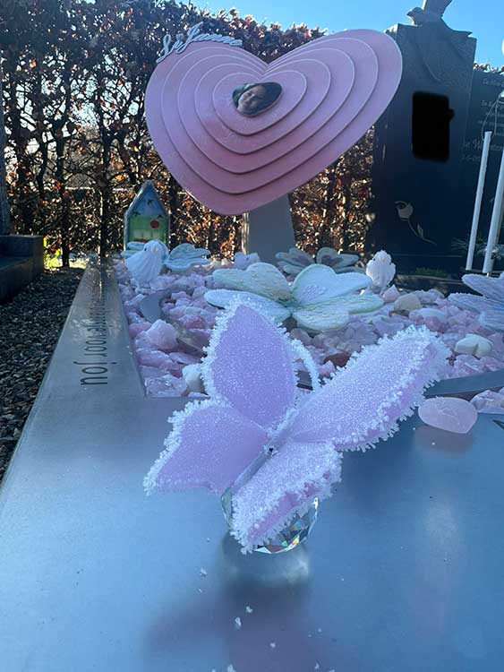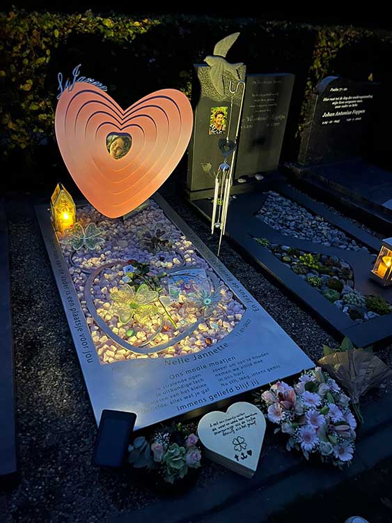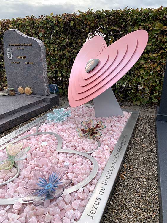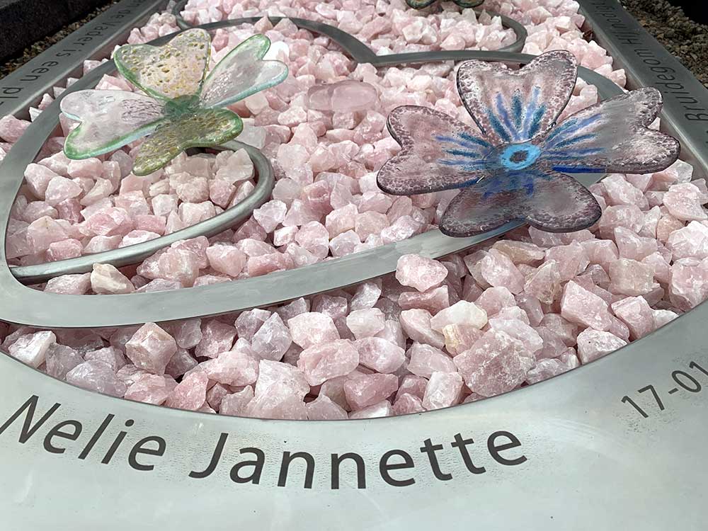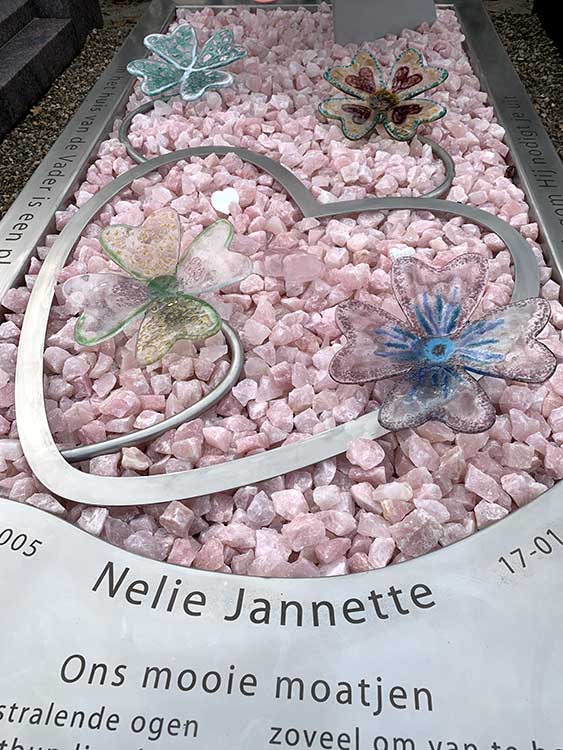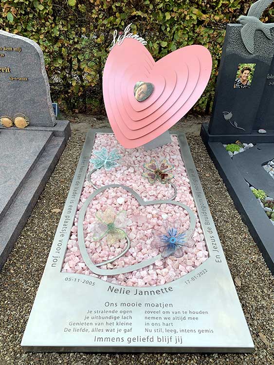 Een bijzonder gedenkteken vol liefde voor een meisje. Haar mooie foto en haar naam in sierlijke letters op prachtige roze harten van RVS . Daarvoor liggen klavertjes vier van glas: ieder gezinslid maakte een eigen klaver onder begeleiding van een glaskunstenaar.