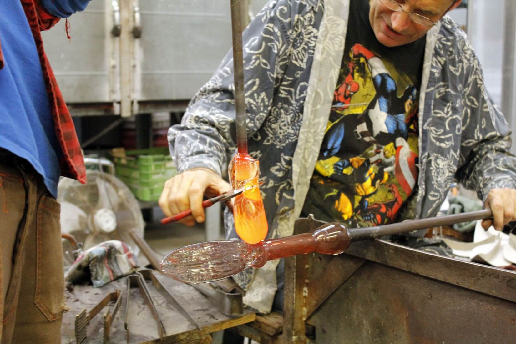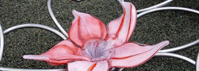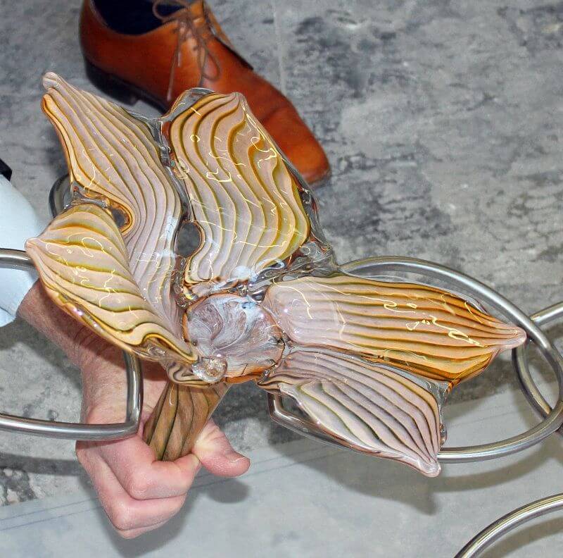 Richard Price – meester-glasblazer uit Engeland – lieten we diverse bloemen met allerlei vormen en kleuren glasblazen. Iedere bloem kreeg een uniek patroon en kleurcombinatie. Tijdens het glasblazen veranderen de kleuren Je weet nooit precies hoe het resultaat zal zijn als een bloem is afgekoeld. Het is voor een deel een spannende verrassing.